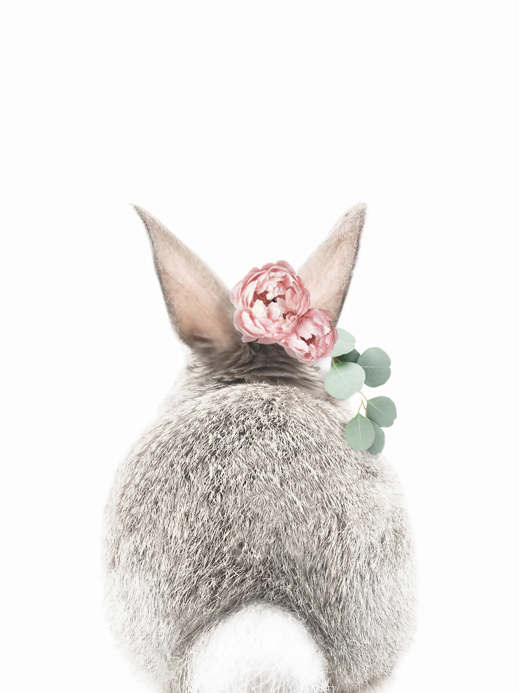 Focus on the bunny's fluffy tail and the surrounding blooms.