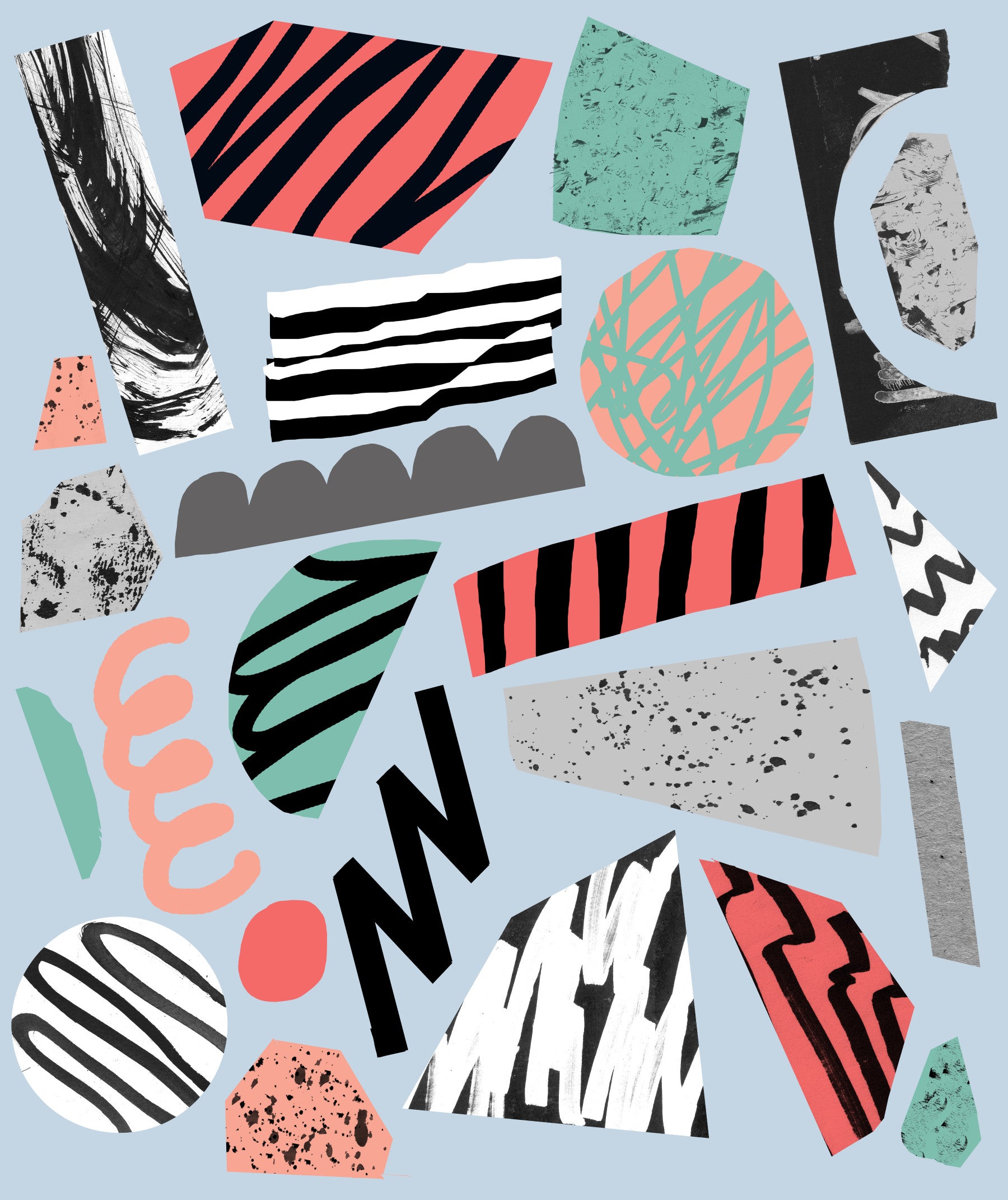 Escape the everyday with Camping Trip a playfully abstract wallpaper that captures the spirit of outdoor adventure. Imagine pitching your tent amidst a landscape of bold shapes and unexpected textures. This design features a collage of brushstrokes, stripes, and speckled patterns in a lively palette of earthy tones like gray, teal, and salmon set against a calming sky-blue backdrop. The fragmented forms evoke the feeling of exploring a wild, untamed terrain, while the mix of smooth and rough textures hints at the tactile experience of nature. Bring the carefree essence of a camping getaway to your screen with this modern and invigorating wallpaper.