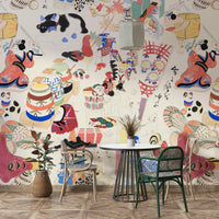 En levende og finurlig chihiro-inspireret tapet med en dejlig række traditionelle japanske elementer. Intrikate detaljer viser charmerende karakterer, legende dyr som en plettet ko og en hane, og miniatyrfestival flyder, alt sammen gengivet i en dristig, farverig stil, der minder om klassiske japanske træbloktryk. Designet fremkalder en følelse af glædelig fest og barnlig undring, perfekt til at tilføje et strejf af fortryllende japansk kunstnerskab til dit digitale rum. Denne livlige mønster afbalancerer komplicerede detaljer med en legende energi, hvilket skaber en visuelt engagerende og fængslende tapet.