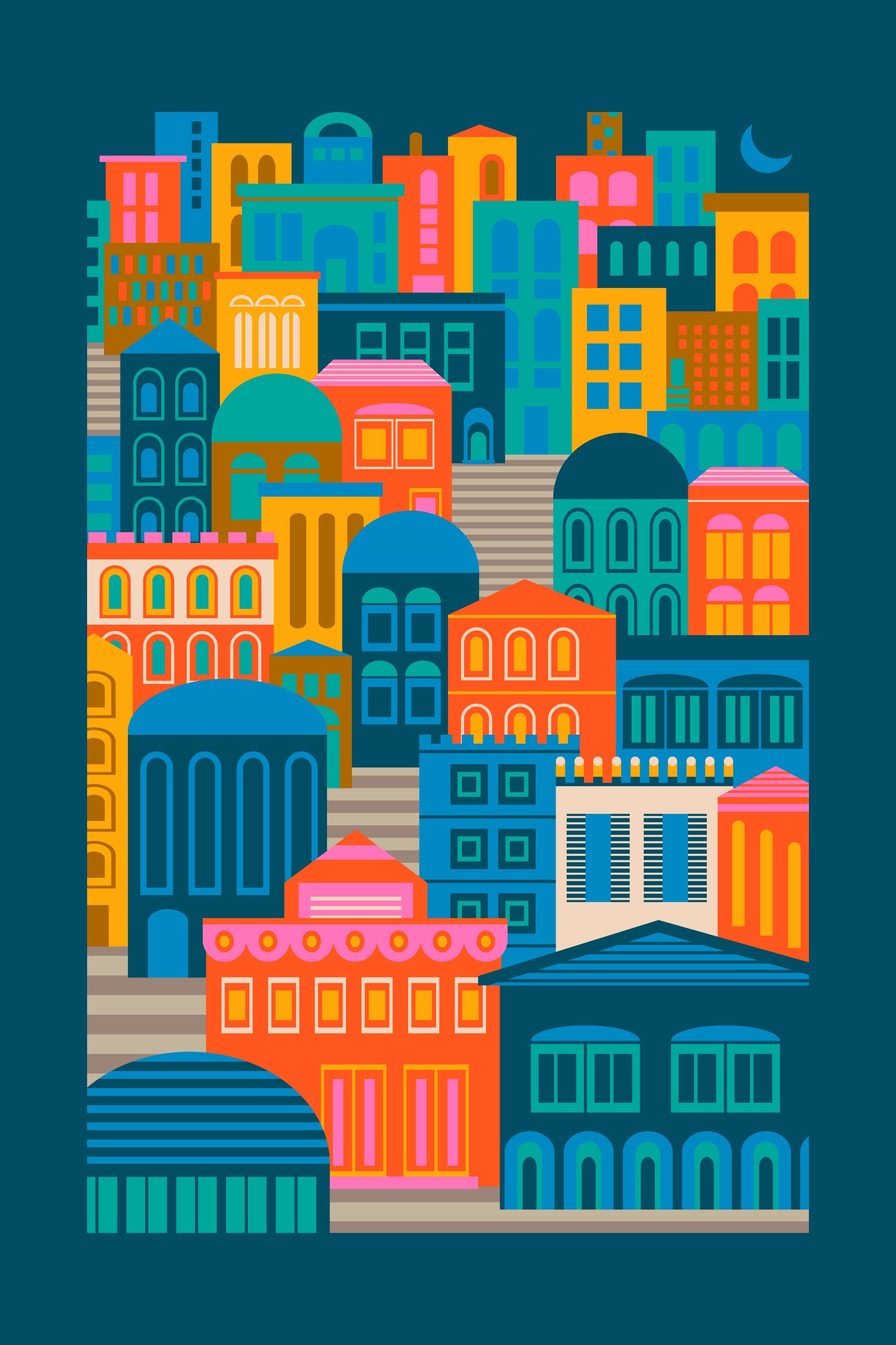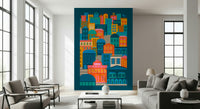 Geometric, colorful architecture buildings, high-rises and houses with a night moon in fun retro Rainbow Brights: Dark Blue, Royal Blue, Coral Orange, Yellow, Pink, Turquoise, Brown and Cream with striped backdrop! Bright, pop and fun cityscape inspired by vintage travel posters! Be sure to check out my co-ordinating "City Lights By Day" Wall Mural too, they make a great pair AND this Wall Mural (great for a statement wall!) is also available in a Repeat Pattern Design wallpaper version too! Original Wall Mural design by Jackie Tahara of UnBlink Studio.