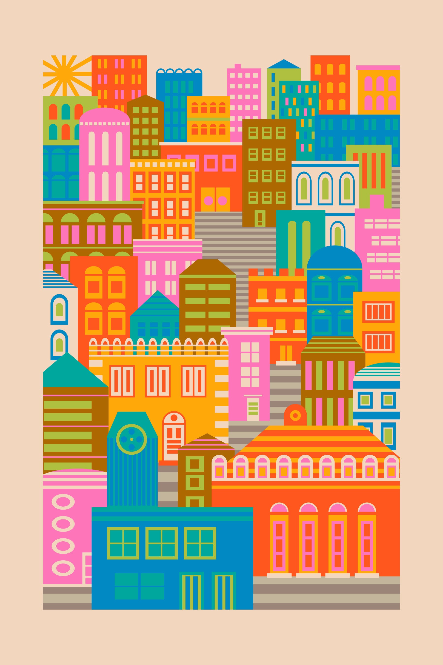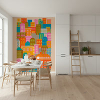 Geometric, colorful architecture buildings, high-rises and houses with sunshine in fun retro Rainbow Brights: Royal Blue, Coral Orange, Yellow, Pink, Turquoise, Green, Brown and White with striped backdrop! Bright, pop and fun cityscape inspired by vintage travel posters! Be sure to check out my co-ordinating "City Lights At Night" Wall Mural too, they make a great pair AND this Wall Mural (great for a statement wall!) is also available in a Repeat Pattern Design wallpaper version too! Original Wall Mural design by Jackie Tahara of UnBlink Studio.