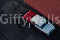 Capture a timeless feel with this image of a vintage car. The blend of bright red and pure white creates a striking design. The scene exudes a casual, urban vibe, ideal for a living room, home office, or hallway. Apply this wallpaper for walls to bring retro style into any space. The image complements interiors with simple shapes and bold color choices, delivering a modern update to any backdrop.