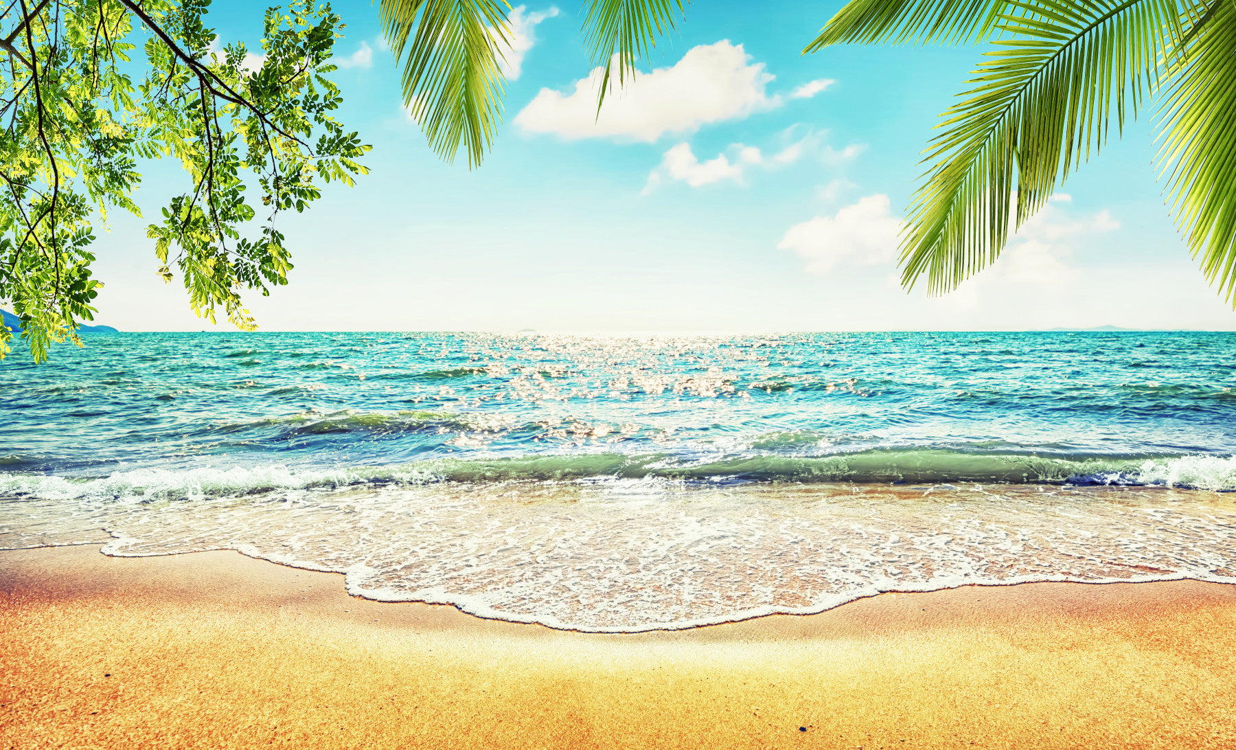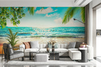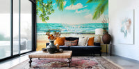 Bring the tranquility of the ocean to your home with this vibrant wallpaper for walls. This design features a stunning beach scene with turquoise water, golden sand, and lush palm trees. The clear blue sky and sparkling sunlight evoke a sense of peace and relaxation. Ideal for creating a serene atmosphere in living rooms, bedrooms, or bathrooms, this wallpaper transforms any space into a coastal retreat. The colors complement interiors with natural light, enhancing the feeling of spaciousness and calm.