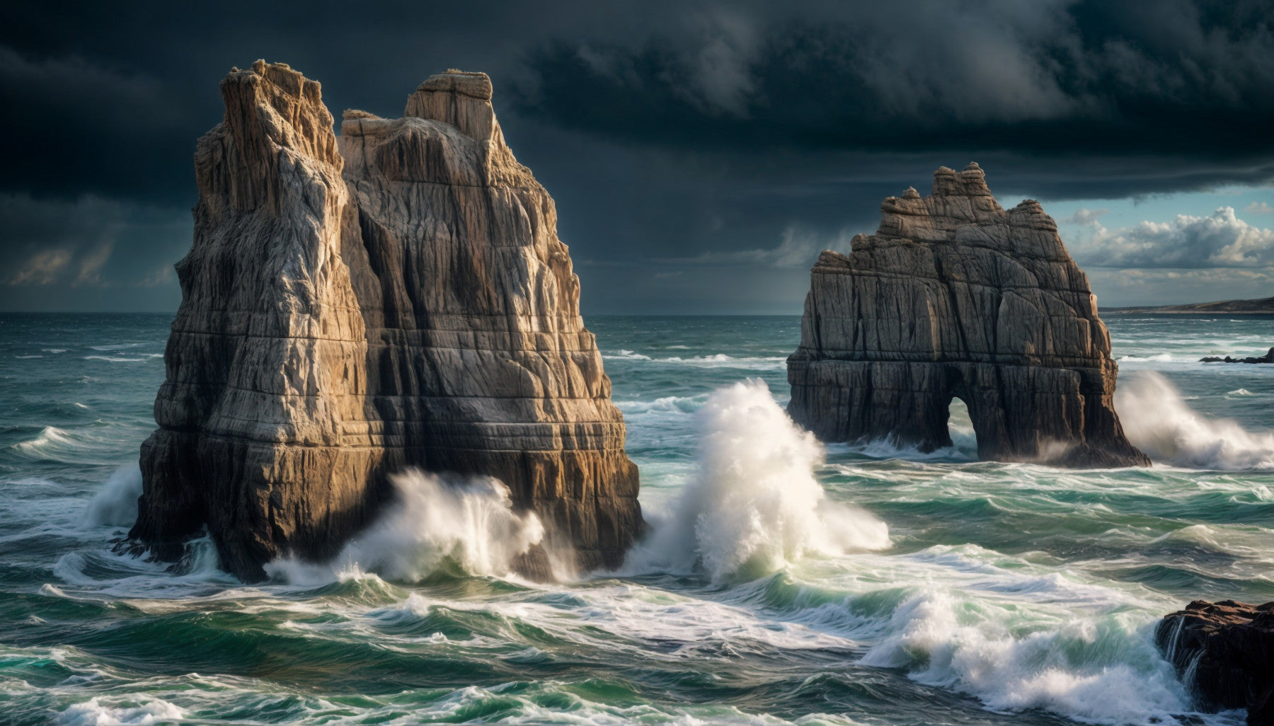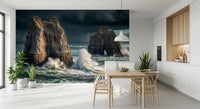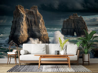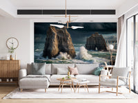 Forvandl din stue med dette fængslende vægtapet. Det fremviser monolitiske klippeformationer, der kæmper mod kraftfulde havbølger under en dramatisk, stormfuld himmel. Farvepaletten blander de dybe blå og grønne farver fra det turbulente hav med de varme beige og grå toner fra de forvitrede klipper. Dette slående design tilføjer en følelse af ærefrygt og ro til ethvert rum. Det fungerer især godt i stuer, kontorer eller gange og skaber et sofistikeret udtryk. Den imponerende tilstedeværelse af kystgiganterne vil helt sikkert fængsle og skabe en uforglemmelig atmosfære.