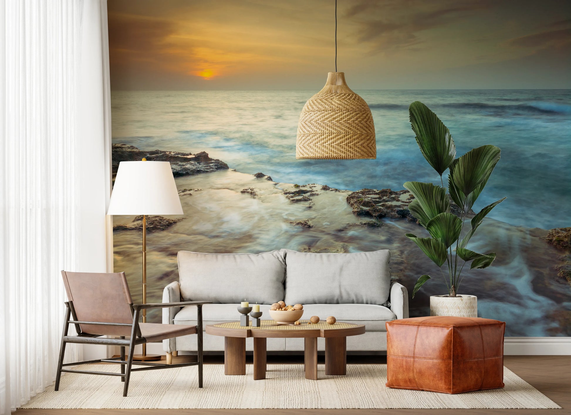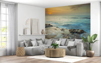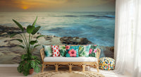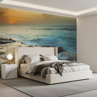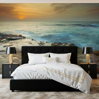 Solnedgang over Palmachim-stranden, Israel. Bad dit rum i den æteriske glød fra 'Coastal Radiance'. Dette design indfanger den fredfyldte skønhed ved kystlinjen ved daggry. Vandets bløde, slørede bevægelse fremkalder en følelse af ro og fred. Varme nuancer fra solens spirende lys spildes over horisonten og reflekteres i de barske, mosklædte klipper, der står fast mod den blide tidevand. Forestil dig havets subtile lyde, der kærtegner kysten, luften tyk af salt tåge. Løft ethvert rum med dette billede og skab et fristed af ro og naturlig skønhed, mens varmt, indbydende lys danser hen over dine vægge.