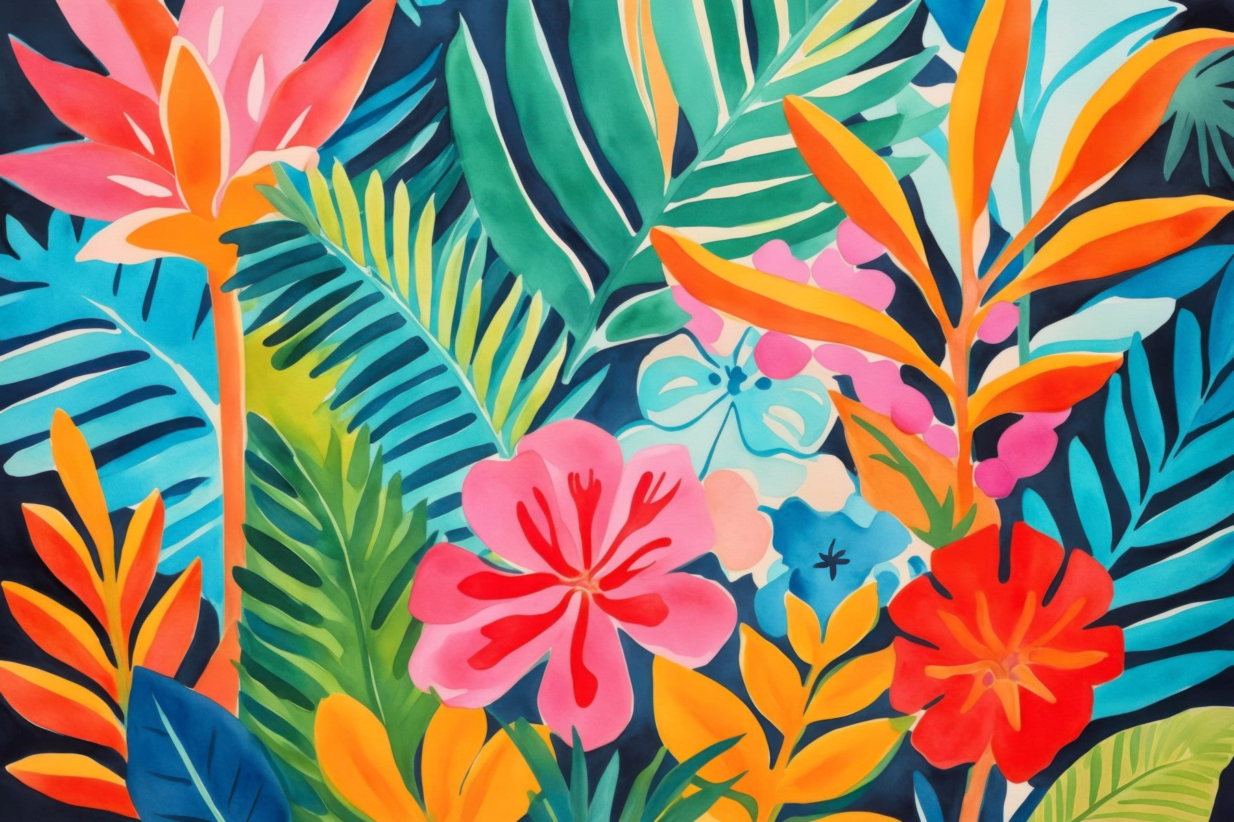 A vibrant botanical design features an array of playful exotic flowers, creating a lively backdrop for your home or office space. Perfect for those looking to infuse tropical energy and personality into their décor, this wallpaper is both eye-catching and versatile. Transform your walls with this delightful floral pattern, and let your creativity bloom.