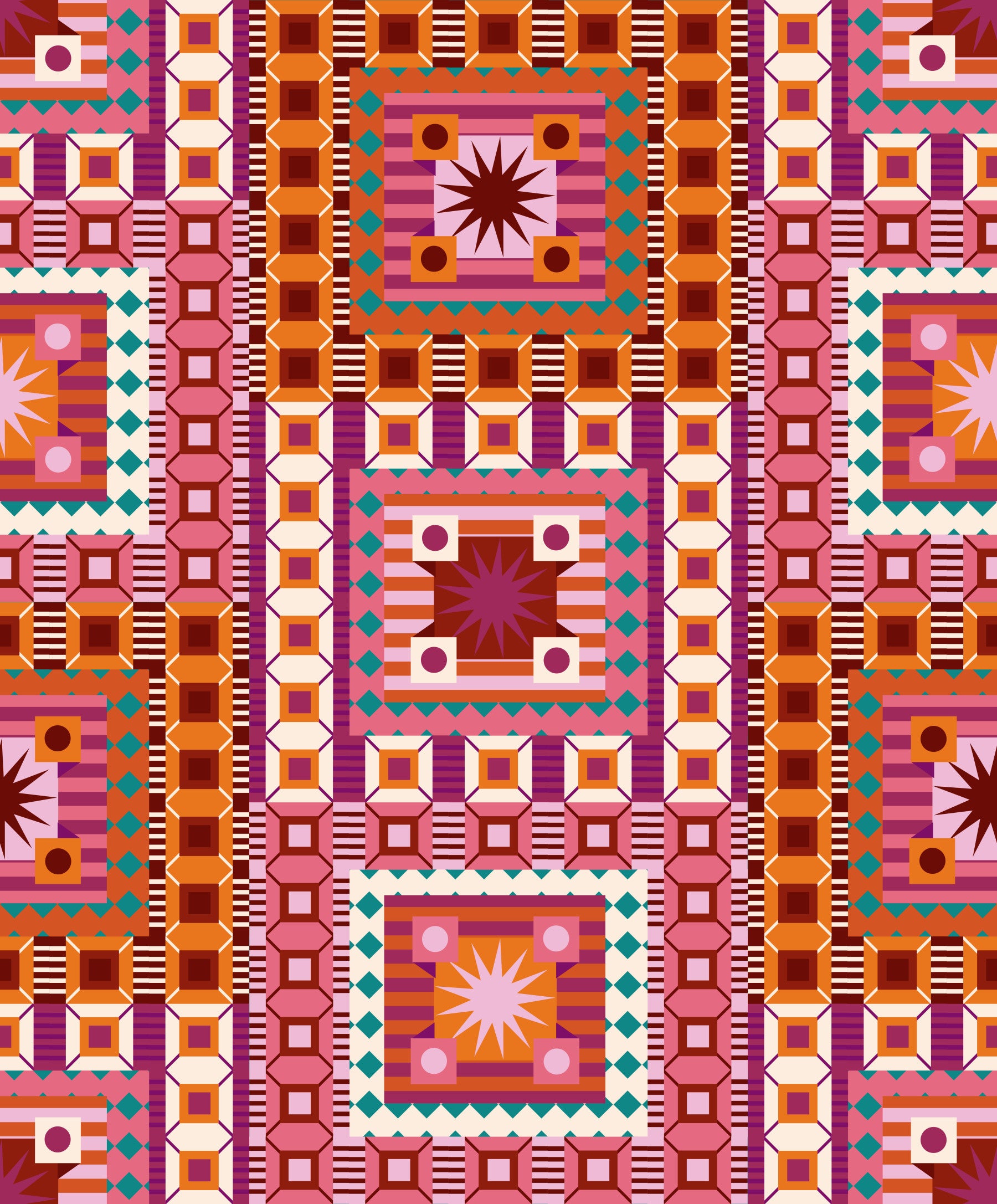 Oplev et dynamisk samspil mellem farver og former med dette slående tapet. Den dristige brug af karminrød, orange og blågrøn skaber et kraftfuldt visuelt udtryk. Geometriske former er mesterligt lagdelt og skaber et komplekst, men afbalanceret mønster. Det gentagne motiv af stjerneskud tilføjer et strejf af legende energi, mens den samlede effekt er sofistikeret og moderne. Perfekt til dem, der søger et tapet med personlighed og et effektfuldt design, vil dette møbel helt sikkert være en samtalestarter.
