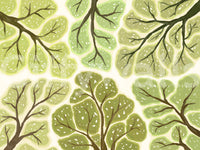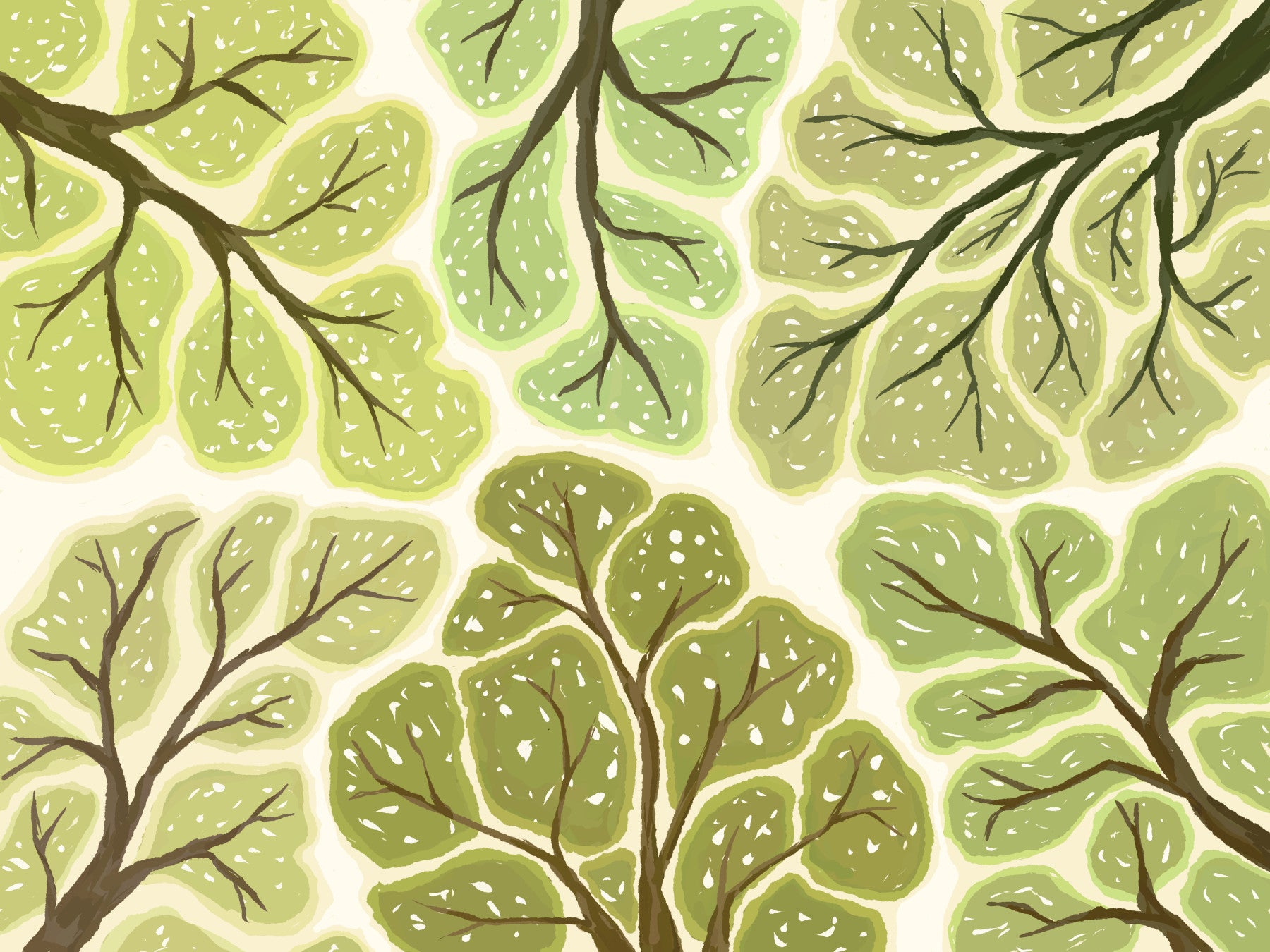 Oplev den fredfyldte skønhed af 'krone generthed' med dette fængslende tapet. Fra en fugleperspektiv afslører den stiliserede skovbaldakin et betagende mønster af individuelle træskroner, der delikat undgår at røre ved hinanden, hvilket skaber en betagende mosaik af grønne og fløde nuancer. Den kunstneriske gengivelse fremkalder en følelse af fredelig harmoni og det spændende naturlige fænomen med kroneblad i en frodig, rolig skov. Dette tapet bringer et strejf af naturens mysterium og undring til din skærm, perfekt til dem, der søger et beroligende, men alligevel visuelt fantastisk digitalt baggrund. Den bløde farvepalet og unikke kunstneriske stil tilbyder en forfriskende visuel flugt.