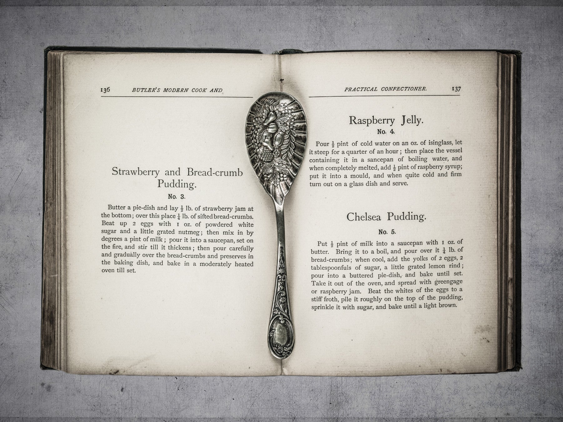 Old cookery book open with an old jam spoon. Step back in time with 'Culinary Antiques,' a vintage wallpaper that celebrates the art of classic cooking. This captivating design features an open page from an antique cookbook, complete with time-worn paper and charming typography, offering recipes for delights like Strawberry and Bread-crumb Pudding, Raspberry Jelly, and Chelsea Pudding. A beautifully ornate, antique silver spoon rests elegantly on the page, hinting at generations of delicious creations. The muted tones and aged textures evoke a sense of nostalgia and warmth, perfect for adding a touch of old-world charm to any space. Ideal for kitchens, dining areas, or studies, 'Culinary Antiques' is more than just a wallpaper; it's a window into a bygone era of culinary artistry and a celebration of timeless recipes that continue to inspire.