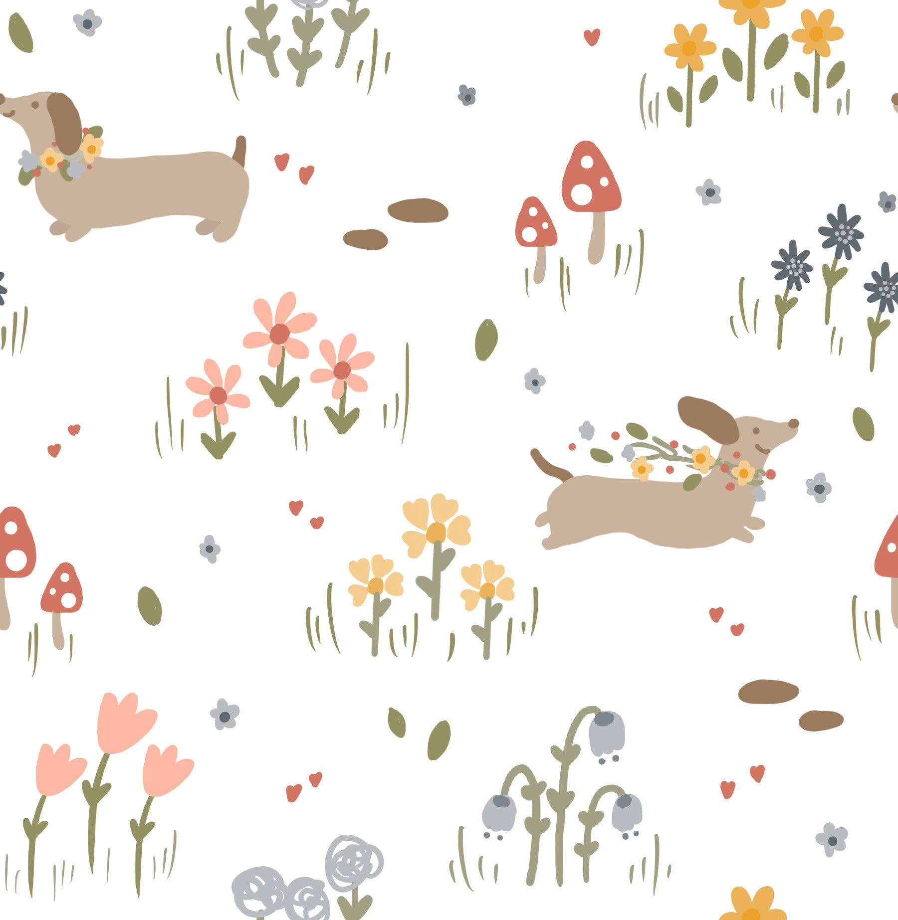 Tilføj et muntert look til ethvert rum med vores tapet med gravhunde og vilde blomster. Med legesyge gravhunde omgivet af farverige blomster, svampe og poteaftryk giver dette design et muntert præg på væggene. Ideelt til børneværelser, legeområder eller rum med kæledyrstema, gør de bløde farver og venlige mønstre det til et sjovt valg for dyreelskere. Den rene hvide baggrund holder det friskt og nemt at parre med enhver indretning. Dette tapet er trykt med omhu og tilbyder en sjov og hyggelig vægmulighed for hundeelskere i alle aldre.