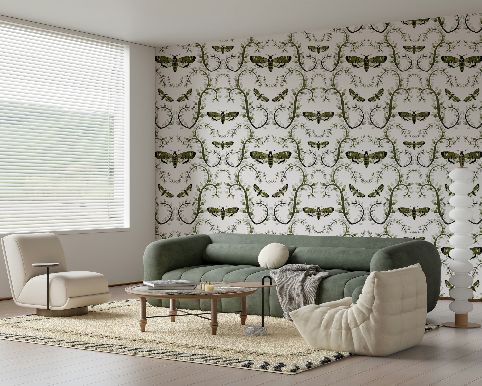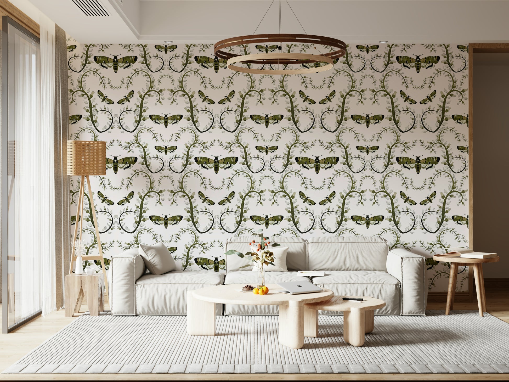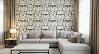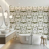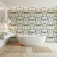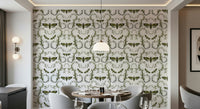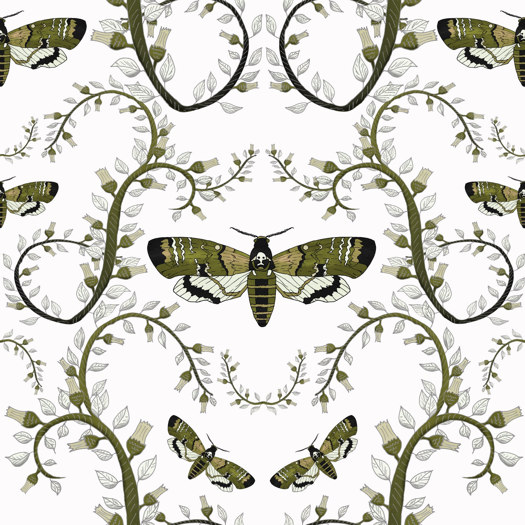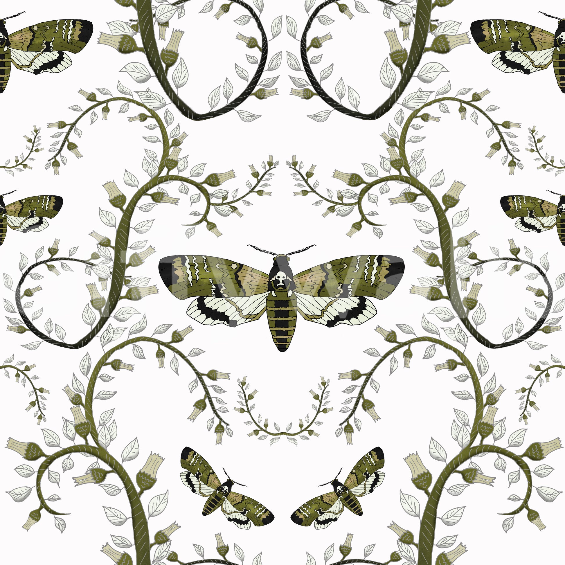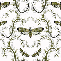This wallpaper features a captivating design of Death's-Head Hawkmoths elegantly intertwined with stylized botanical elements. The moths, rendered in a rich olive green and black, contrast beautifully against the soft, silvery-grey leaves and beige flower buds. The intricate, swirling vines create a sense of movement and elegance, while the moths themselves add a touch of mystery and intrigue. The overall effect is a sophisticated and slightly gothic aesthetic, perfect for adding a unique touch to any room.