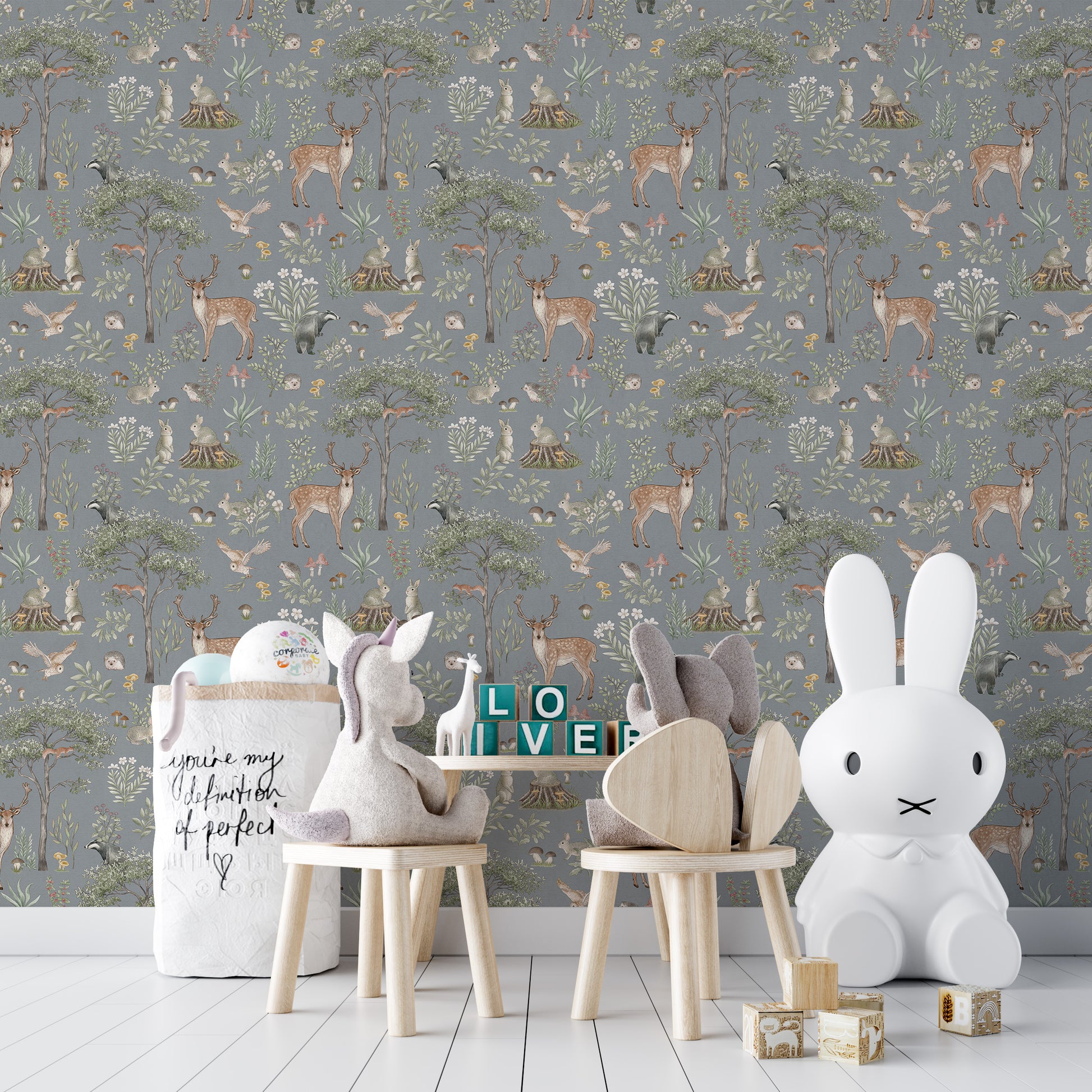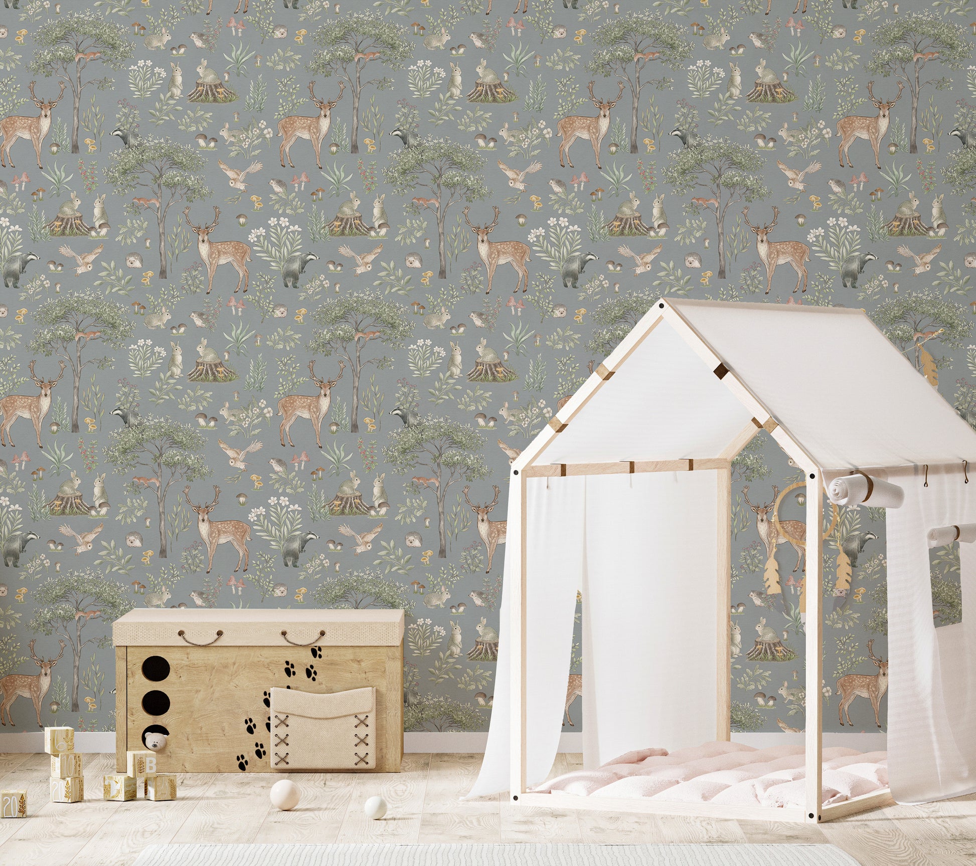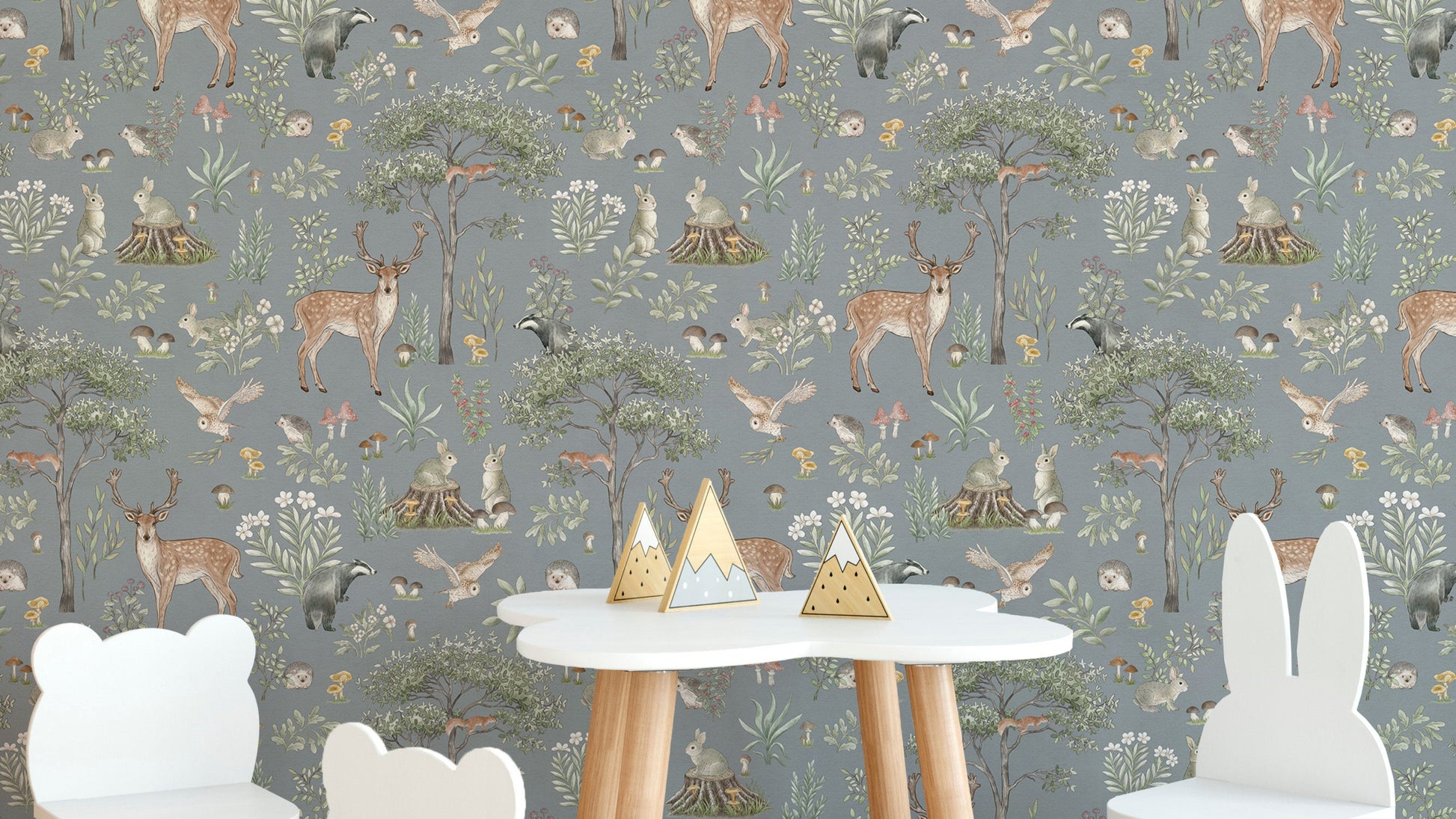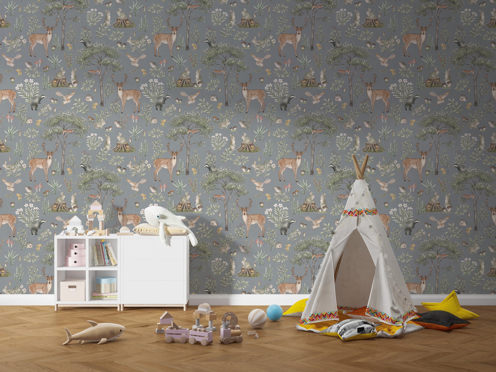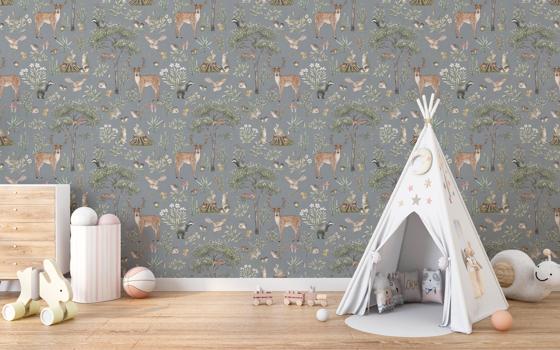 Inviter charmen af natur Indendørs med dette støvede blå tapet med dyreliv. Med yndefulde hjorte, sarte skovdyr og blomstrende grønt vækker dette design en eventyrlig skov til live. Den kølige, støvede blå baggrund skaber en beroligende atmosfære, hvilket gør det til et ideelt valg til børneværelser, soveværelser eller hyggelige læsekroge. De håndmalede detaljer tilføjer varme, mens hjorte-tapettemaet introducerer et tidløst, rustikt præg. Uanset om det er parret med træteksturer eller bløde møbler, passer dette tapet problemfrit ind i forskellige indretningsstile og tilbyder et fredeligt tilflugtssted inspireret af den store natur.