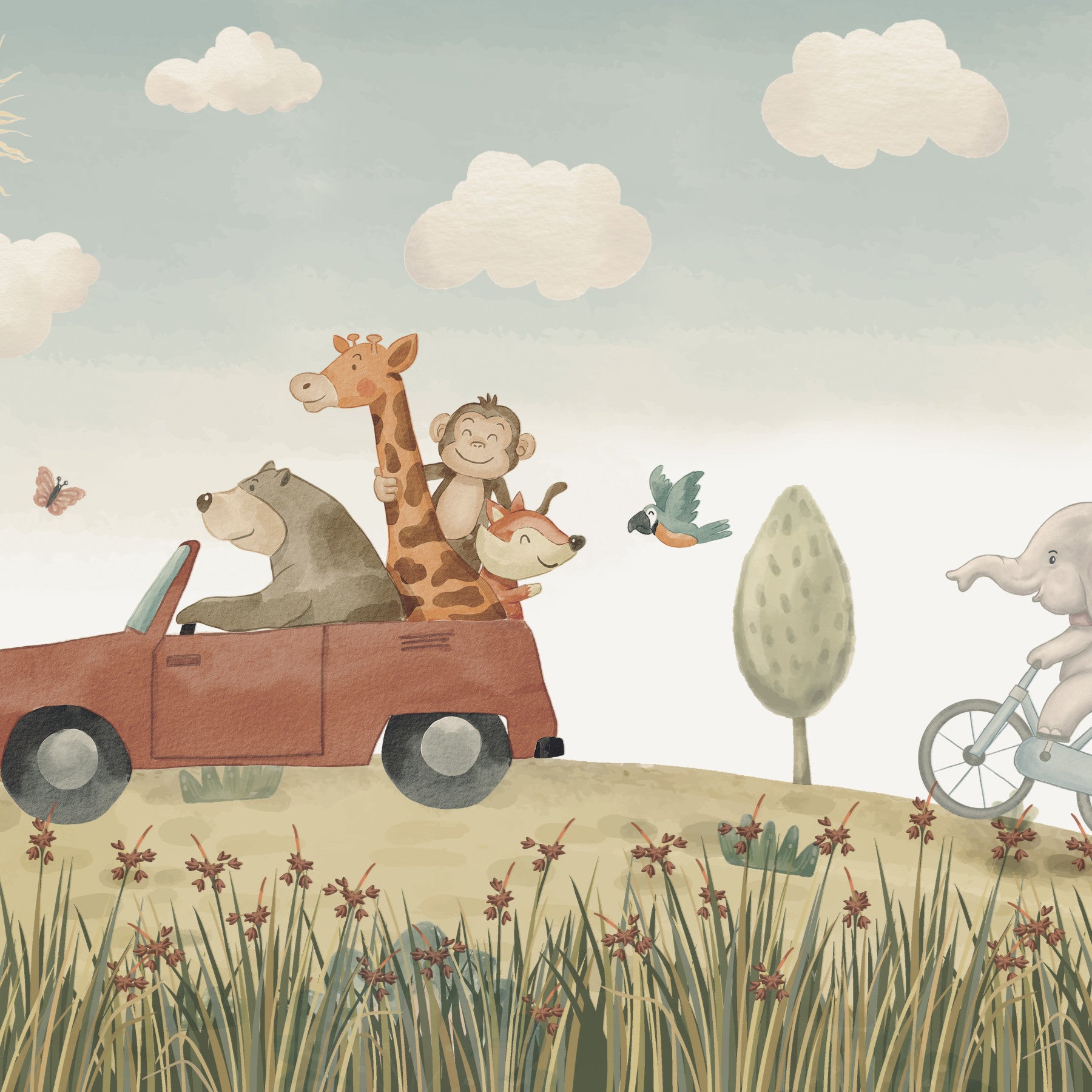 Tag på et charmerende dyretapet-eventyr med dette dejlige design! En illustration i akvarelstil viser en gruppe nuttede dyr, der begiver sig ud på en naturskøn rejse. En bjørn, giraf, abe og ræv sidder lykkeligt klemt ind i en smuk rød bil, mens en elefant cykler ved siden af ​​med en blomsterkurv på sin cykel. Dette legende dyretema-tapet bringer historiefortælling til live, hvilket gør det til et ideelt valg til børneværelser og børneværelser. Den bløde farvepalet og de delikate penselstrøg skaber en fredelig atmosfære, mens de finurlige dyrefigurer tilføjer et strejf af glæde og fantasi. Uanset om du indretter et børneværelse eller leder efter et rejsetema-tapet til børn, indfanger dette design ånden af ​​eventyr og venskab. De charmerende detaljer, såsom sommerfugle og græsklædte landskaber, forstærker følelsen af ​​et eventyrbogsmaleri, perfekt til en børneværelsesvæg eller et lærerigt legeområde. Derudover, da det fås i selvklæbende dyretapetformat, tilbyder det en nem opdatering uden rod.