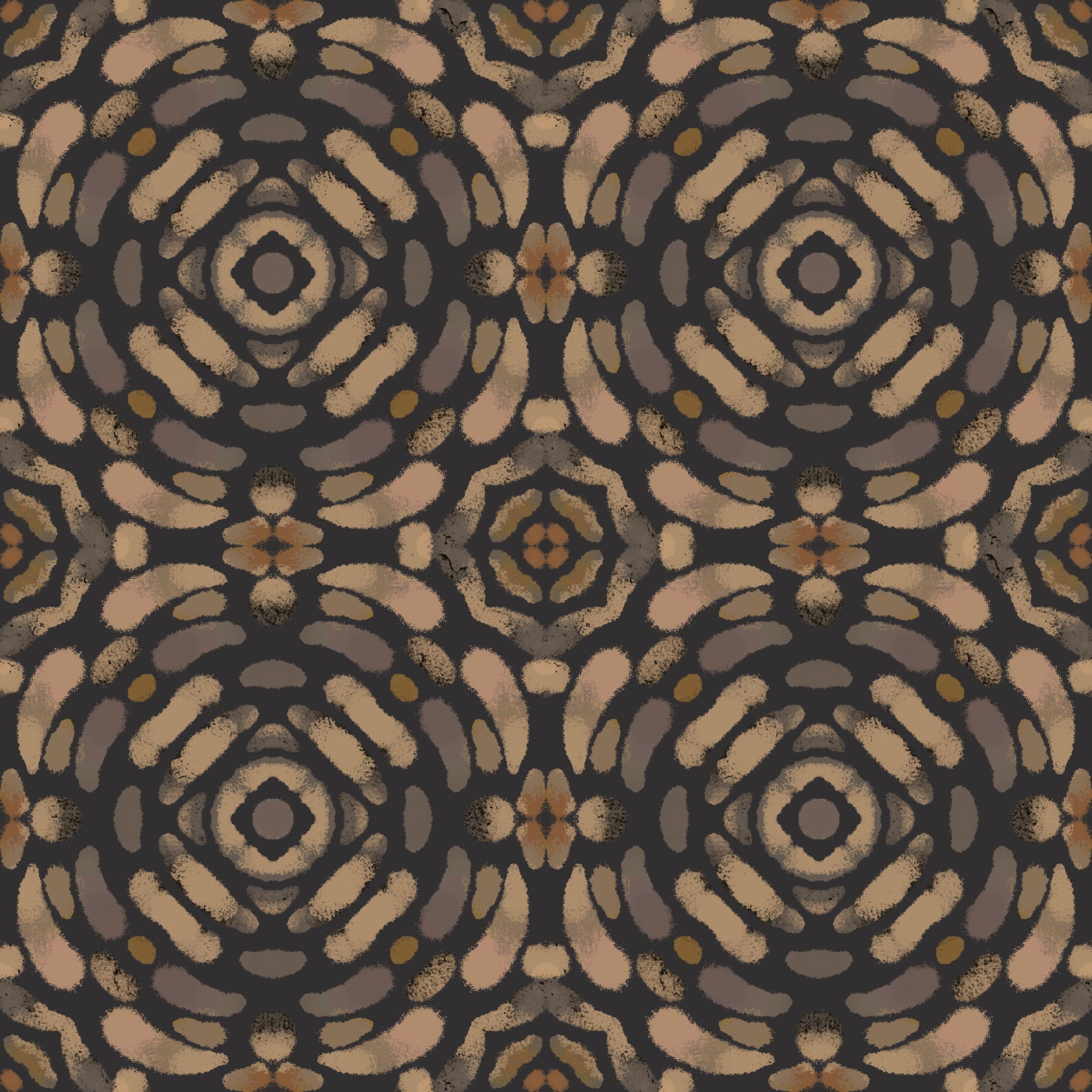 Earth-toned symmetrical pattern with warm browns, beiges, and natural geometric shapes.