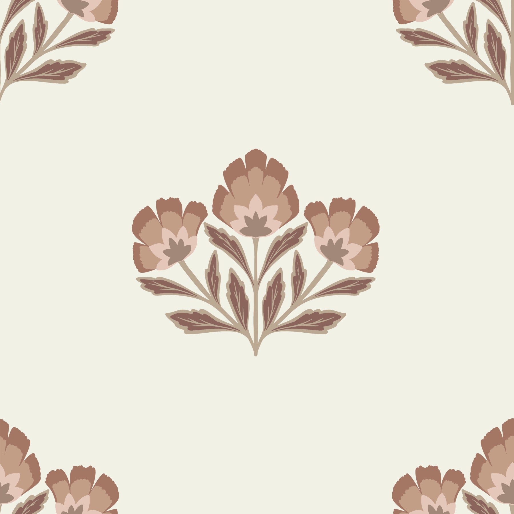 Serene wall mural, repeated flower image, soft brown leaves, Earthy Flora.
