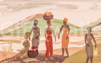 Immerse yourself in the warmth and vibrancy of African heritage with "Echoes of the Motherland." This exquisite wallpaper captures the essence of a bountiful harvest and the enduring spirit of African women. Graceful figures, adorned in vividly colored traditional attire, stand against a serene landscape of hills and water, their silhouettes conveying strength and elegance. The scene is punctuated by baskets overflowing with nature's bounty, symbols of prosperity and community. The soft, earthy tones create a calming yet visually striking backdrop, making it ideal for bringing a touch of cultural richness and tranquility to your digital space. Let this artwork transport you to a land where beauty, tradition, and the harvest of joy intertwine, creating a captivating celebration of the Motherland.