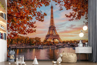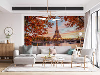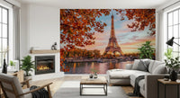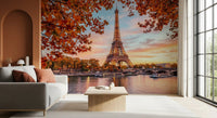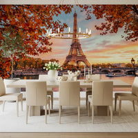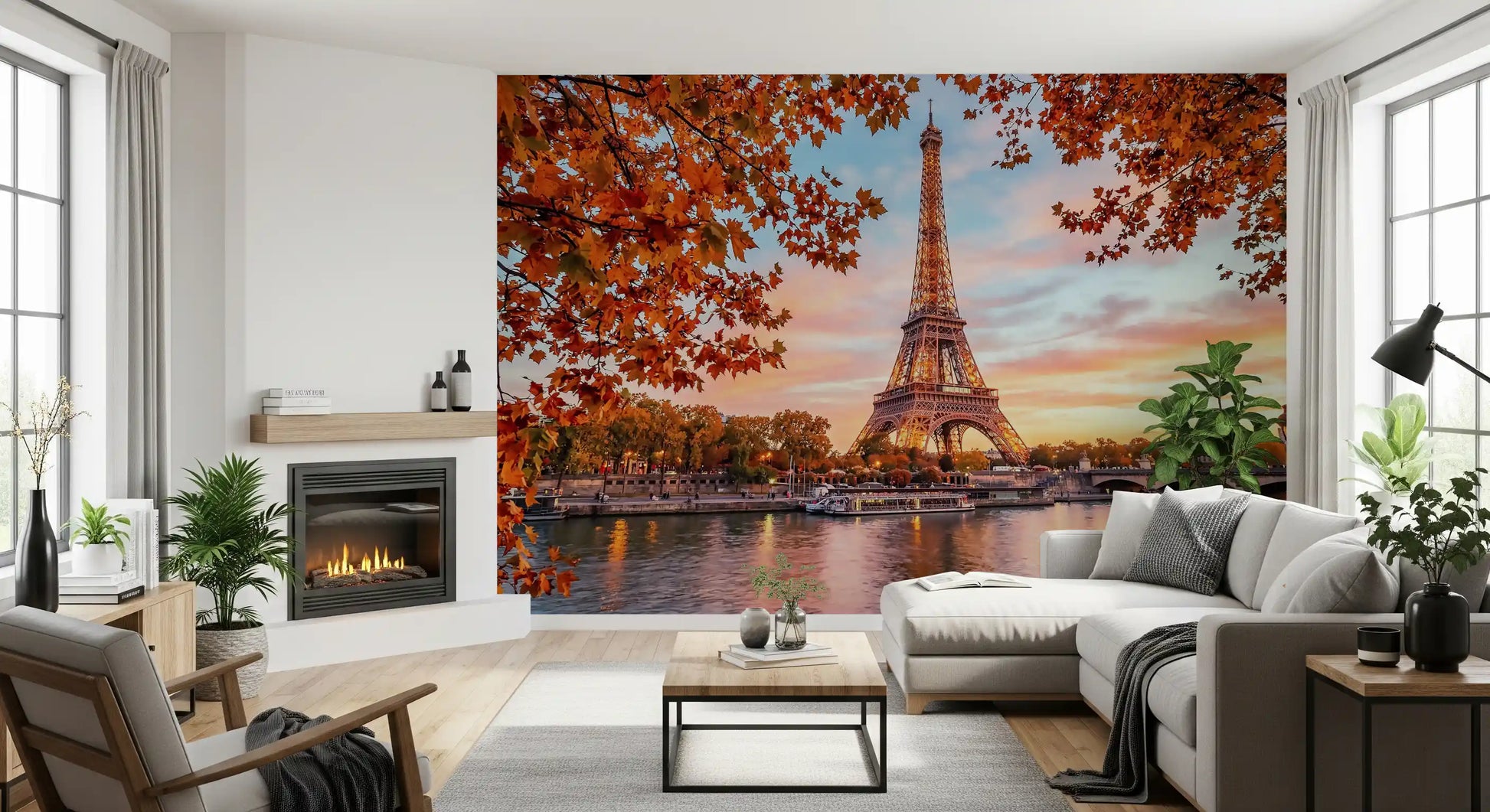 Dette fantastiske vægtapet indfanger det ikoniske Eiffeltårn badet i de varme nuancer af en efterårssolnedgang. Livlige orange og røde blade indrammer scenen og inviterer øjet til det majestætiske vartegn og den rolige Seine-flod nedenfor. Himlen glimter i bløde lyserøde, orange og blå farver, der smukt reflekteres på vandoverfladen. Dette møbel bringer en følelse af romantik og storhed og forvandler ethvert interiør til en malerisk parisisk flugt. Dens rige, varme palet komplementerer perfekt stuer, spisestuer eller soveværelser og tilføjer sofistikeret charme og en betagende udsigt. Det detaljerede efterårsløv tilføjer naturlig tekstur og dybde, hvilket får hele rummet til at føles levende og indbydende.
