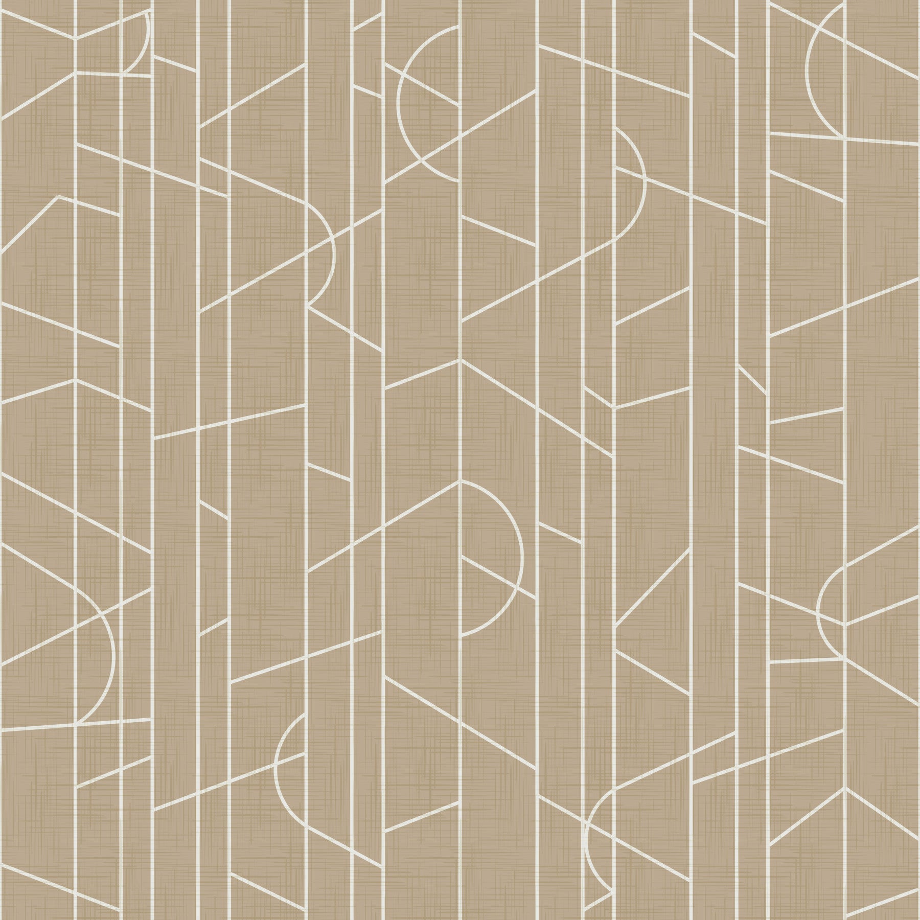 Dette sofistikerede tapet, med titlen "Elegant Lines Decor Safari Canvas", kan prale af et fængslende samspil mellem rene, geometriske linjer og en subtil tekstureret, jordisk beige baggrund. Designet har et gentagende mønster af krydsende linjer, der danner trekanter og delvise cirkler, hvilket skaber en følelse af diskret elegance og moderne minimalisme. De off-white linjer skiller sig skarpt ud mod det strukturerede baggrund og ligner et raffineret linned eller lærredsvæv og fremkalder en følelse af naturlig luksus. Dette tapet blander problemfrit moderne geometrisk design med et strejf af rustik charme, perfekt til at tilføje et strejf af raffinement til ethvert rum.