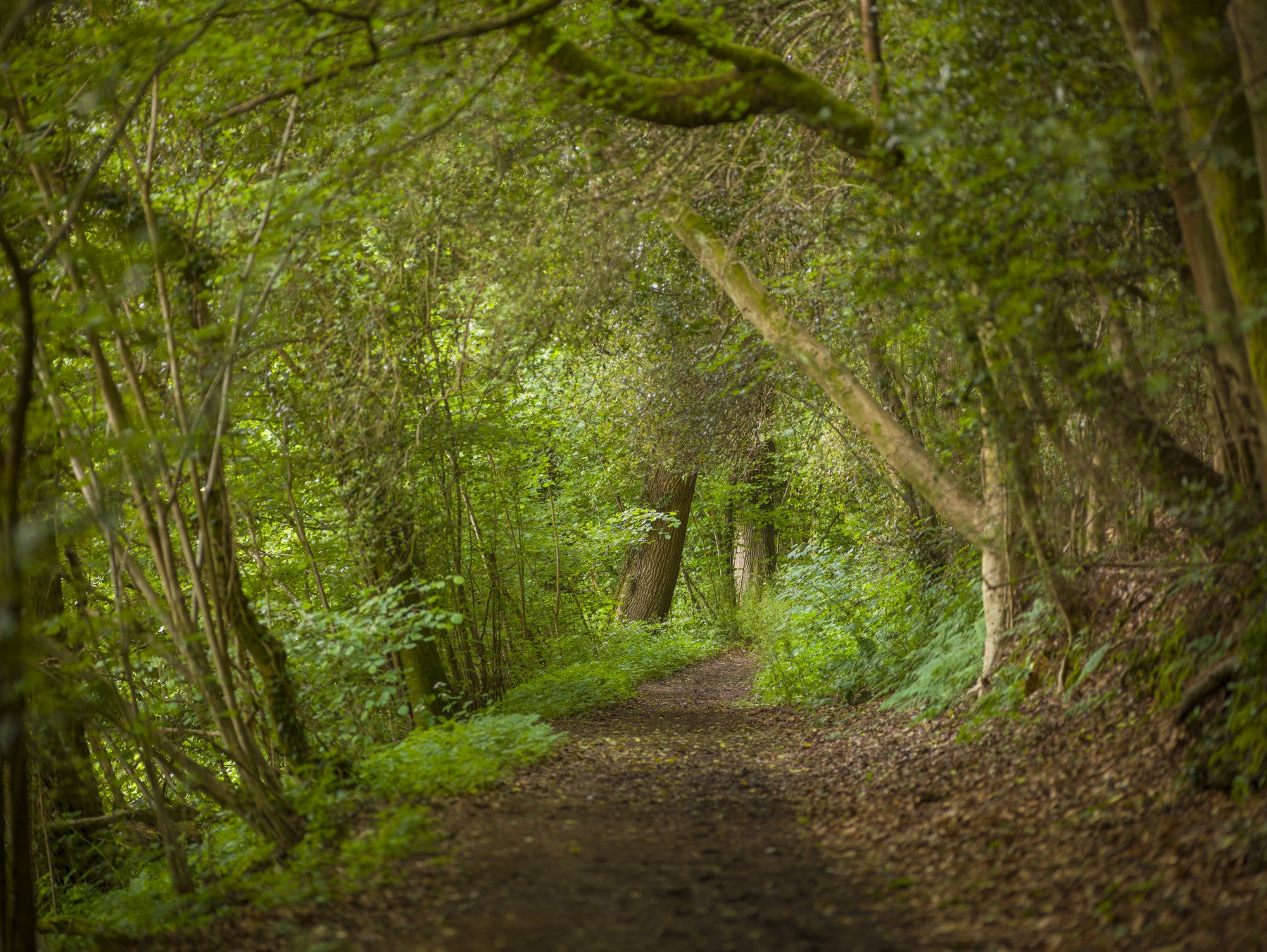 Calming wood path wallpaper dense overhead boughs quiet atmosphere.