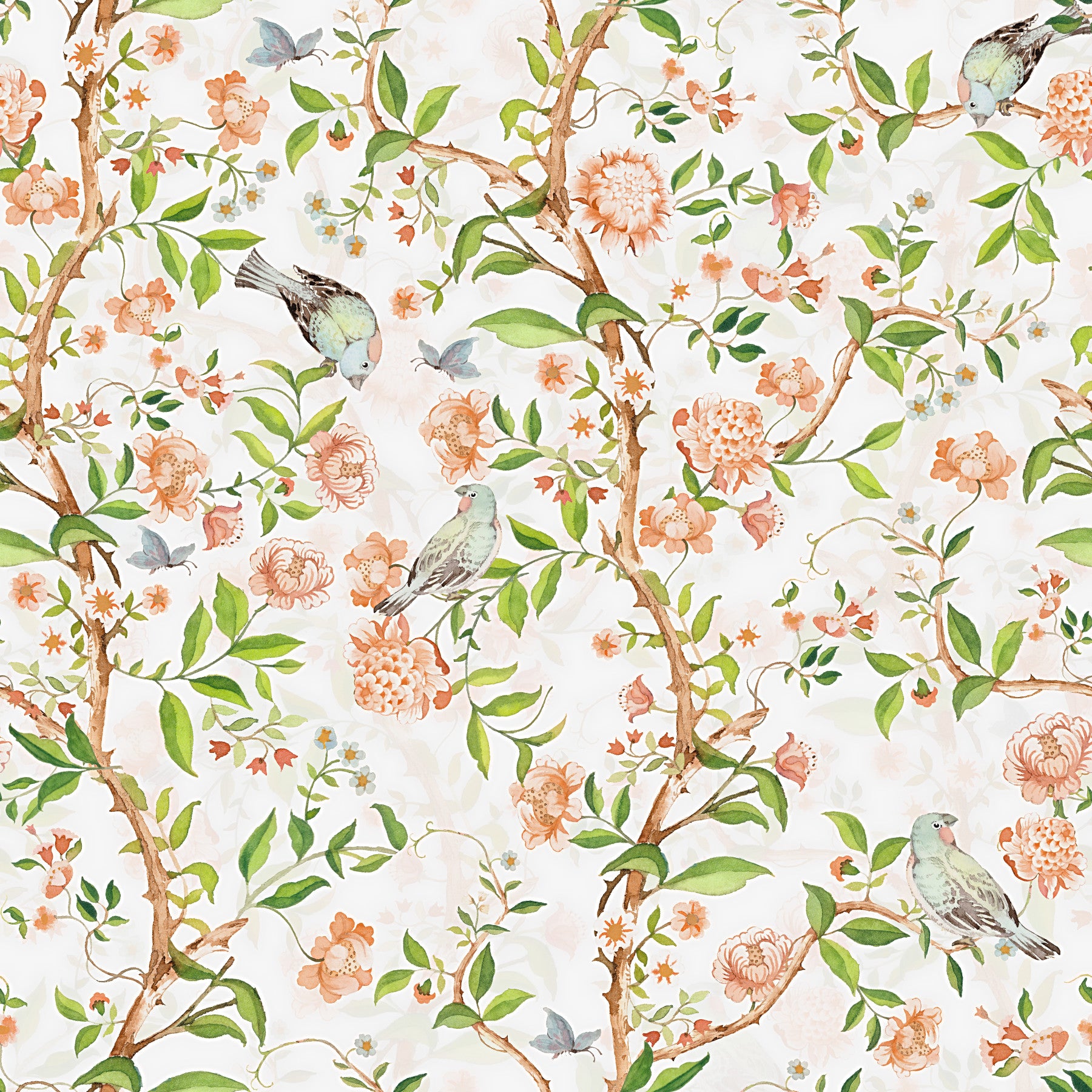 Wallpaper with pink and cream flowers, green leaves, and birds.