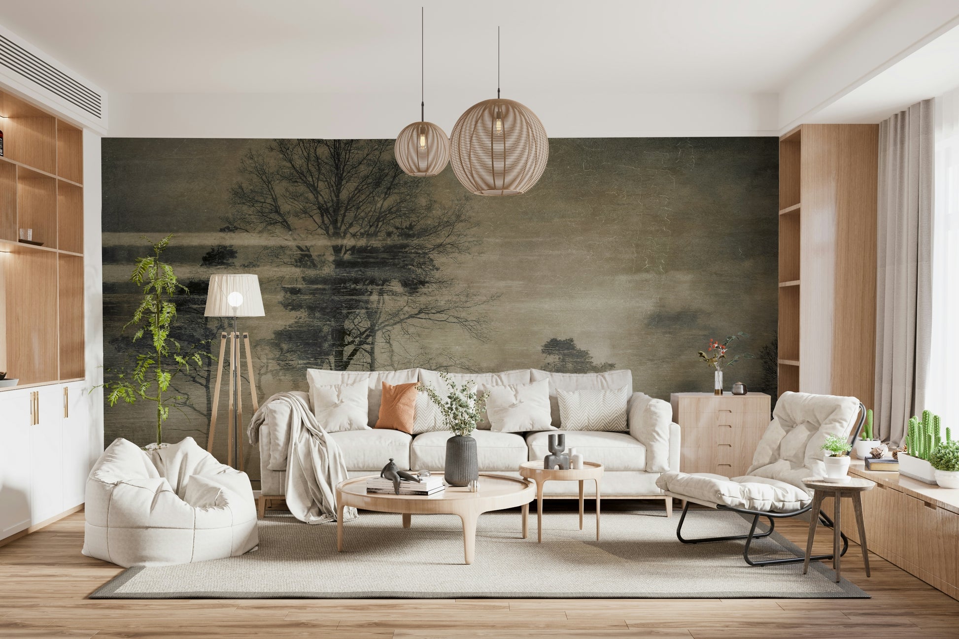 Transform your space with this tranquil forest wallpaper for walls. The design evokes a sense of calm with its muted tones of beige, brown, and gray, perfect for bedrooms and living rooms. The misty trees create a serene atmosphere, bringing a touch of nature indoors. It complements minimalist and rustic interiors, adding depth and visual interest to any room.