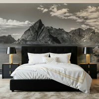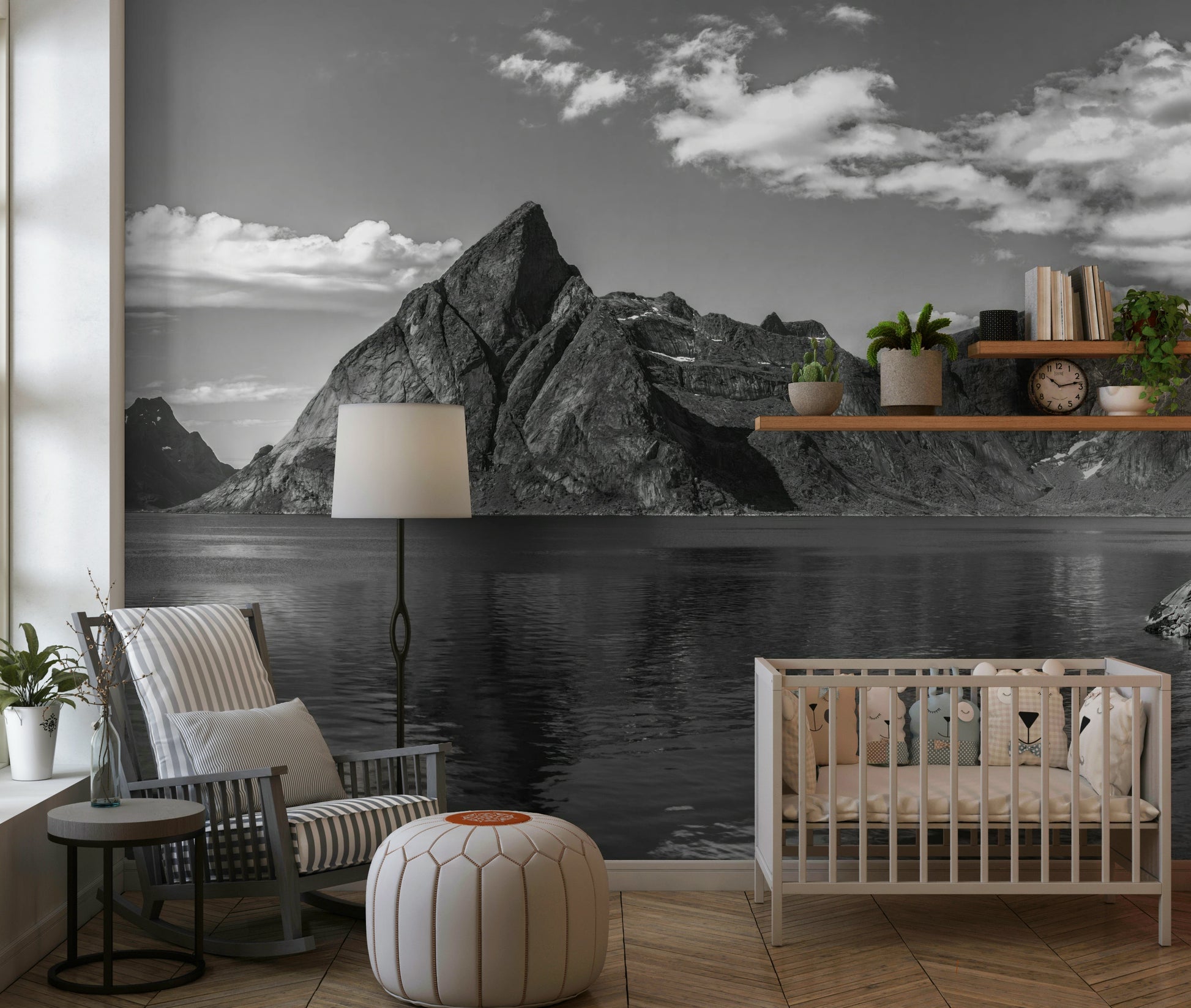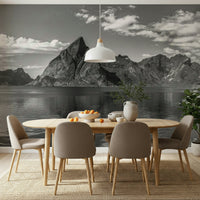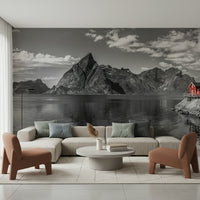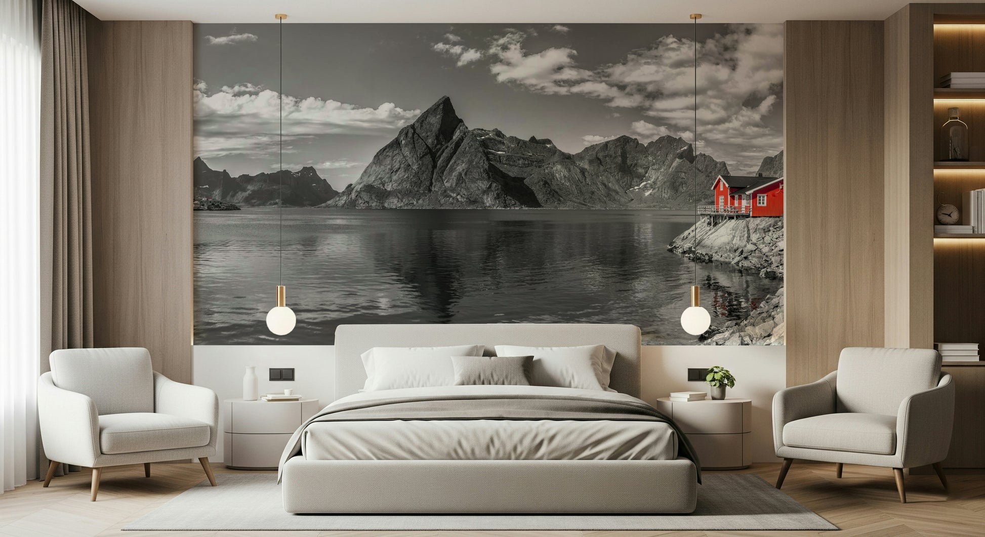 Norwegian fjord, Lofoten, Norway. Immerse your space in the serene beauty of the Norwegian Fjords. This striking wall décor captures the raw, majestic power of nature, featuring towering monochrome mountains reflected in the tranquil waters. A vibrant red cabin perches on the rocky shoreline, providing a vivid focal point against the stark landscape, infusing the scene with warmth and character. The interplay of light and shadow accentuates the rugged textures of the mountains and the subtle ripples of the water, creating a captivating visual experience. Invite the spirit of adventure and the timeless allure of the Nordic wilderness into your home with this breathtaking piece, transforming any room into a sanctuary of peace and reflection.