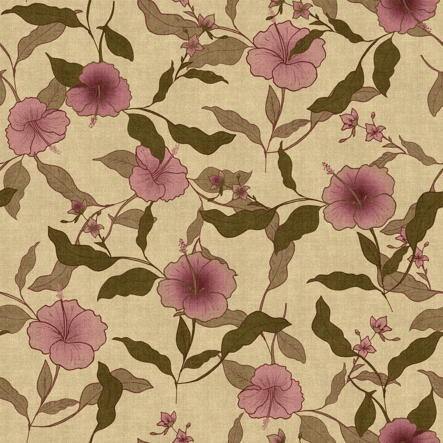 Warm Faded Floral motif, neutral beige background botanical wall covering.