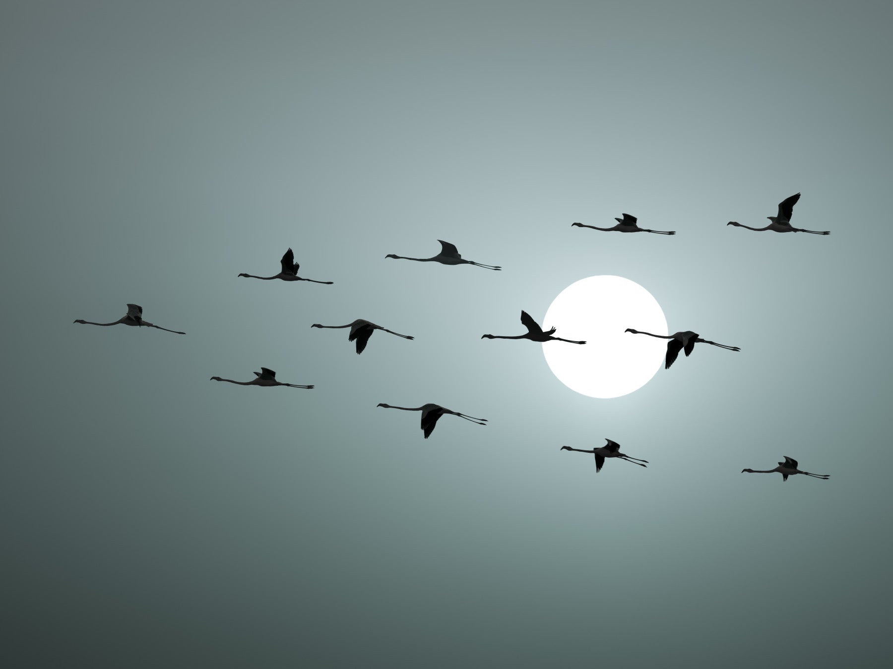 The image shows a flock of flamingo silhouettes.