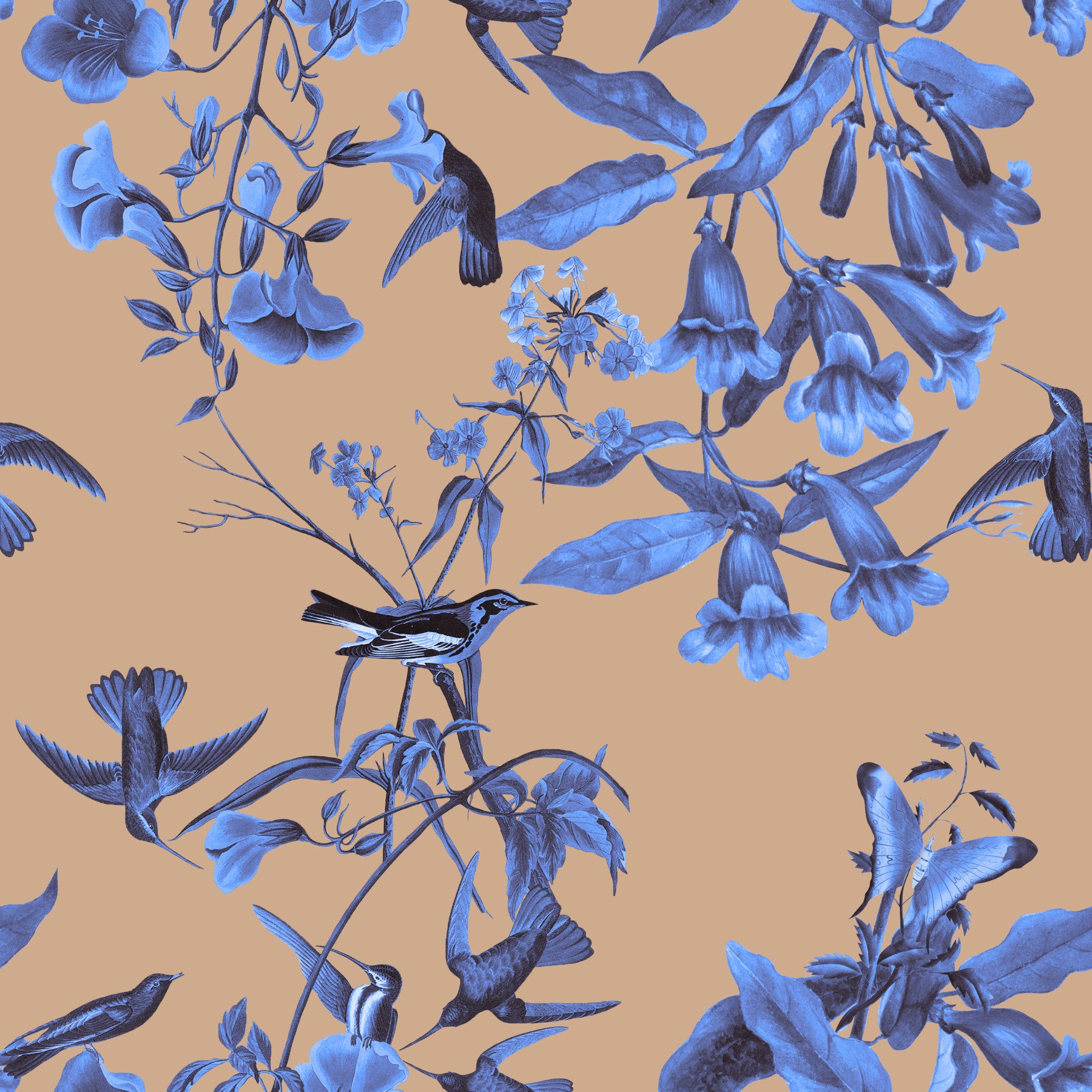 Bring nature's beauty indoors with this charming floral flight scene. This wallpaper features delicate blue flowers and graceful birds in a serene composition. The design creates a calming ambiance for bedrooms, living rooms, or a cozy reading nook. It offers a nature-inspired style. This wallpaper for walls complements interiors that embrace classic elegance or botanical themes. Its soft hues and intricate detail ensure a sophisticated look throughout your home.