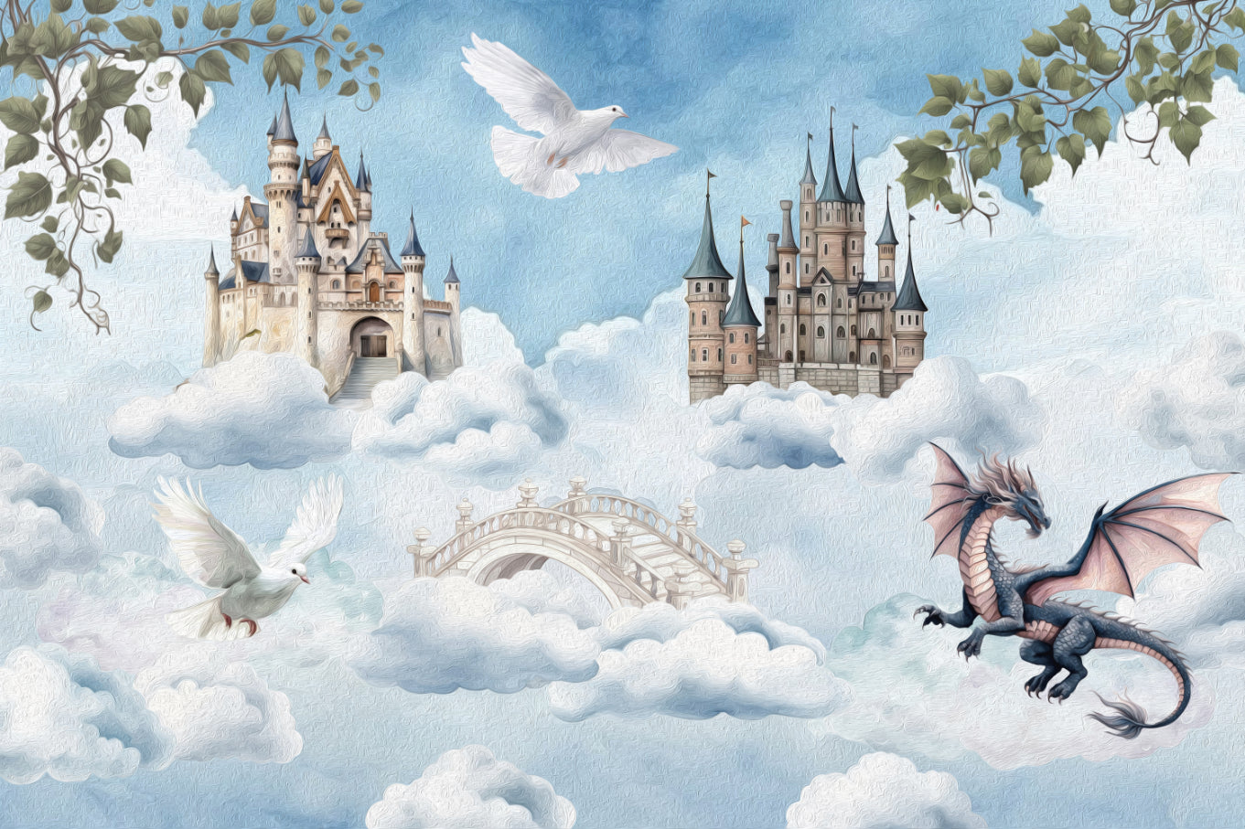 Majestætiske slotte hæver sig over blødhed skyer, hvilket skaber en drømmende, vidunderfyldt atmosfære. En vild, men elegant drage svæver gennem himlen og tilføjer et strejf af eventyr. Fantasy-slottapetet blander indviklede detaljer med bløde pasteller, der bringer en eventyrlig vision til live. Svævende broer forbinder slottene, mens duer glider yndefuldt og fremhæver det magiske himmelslotsmaleri. Dette flyvende dragetapet bringer mytisk charme til ethvert rum, perfekt til fantasielskere. Skyer omslutter scenen og skaber en finurlig effekt. Det fortryllede eventyrtapet fylder interiøret med en mystisk tilstedeværelse, hvilket gør det svævende slotsmaleri virkelig fortryllende.