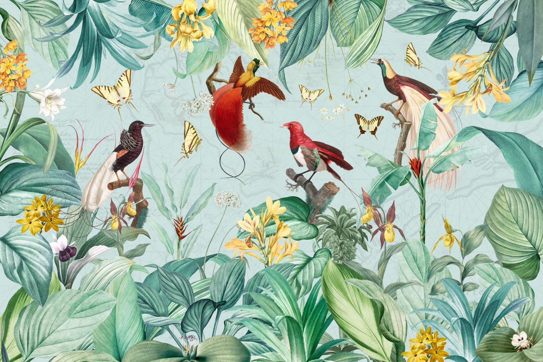 Dette fantastiske tapet har en betagende vifte af livlige tropiske fugle og frodige løv. De detaljerede illustrationer af Birds of Paradise, i deres fulde pragt, er et midtpunkt i dette design, der er suppleret med forskellige andre aviære arter. Baggrunden af ​​et kort i antik stil tilføjer et lag af intriger og eventyr, der fremkalder en følelse af udforskning og opdagelse. De rige greener, røde, gule og bleg blues skaber en harmonisk og sofistikeret farvepalet, der udstråler varme og ro. Perfekt til at skabe en fængslende og luksuriøs atmosfære i ethvert rum, dette tapet lover at omdanne dit værelse til en pulserende og fordybende flugt til et tropisk paradis. Dets kunstneriske design gør det til et udsagnsstykke ideelt til stuer, soveværelser eller gange, der transporterer seerne til en verden af ​​livlig skønhed og naturligt vidunder.