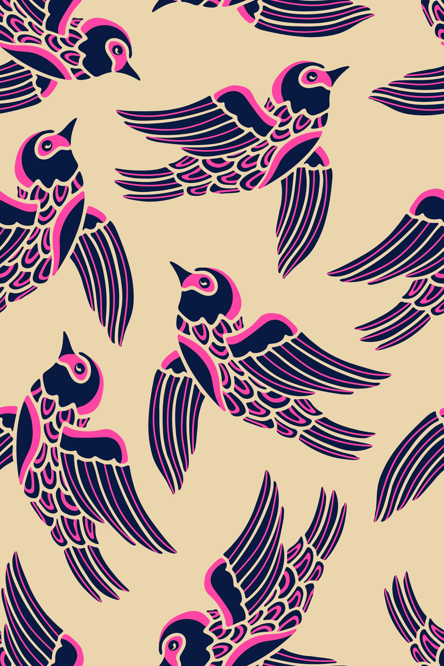 Wallpaper featuring birds in flight against a fuchsia, midnight blue, and beige background.