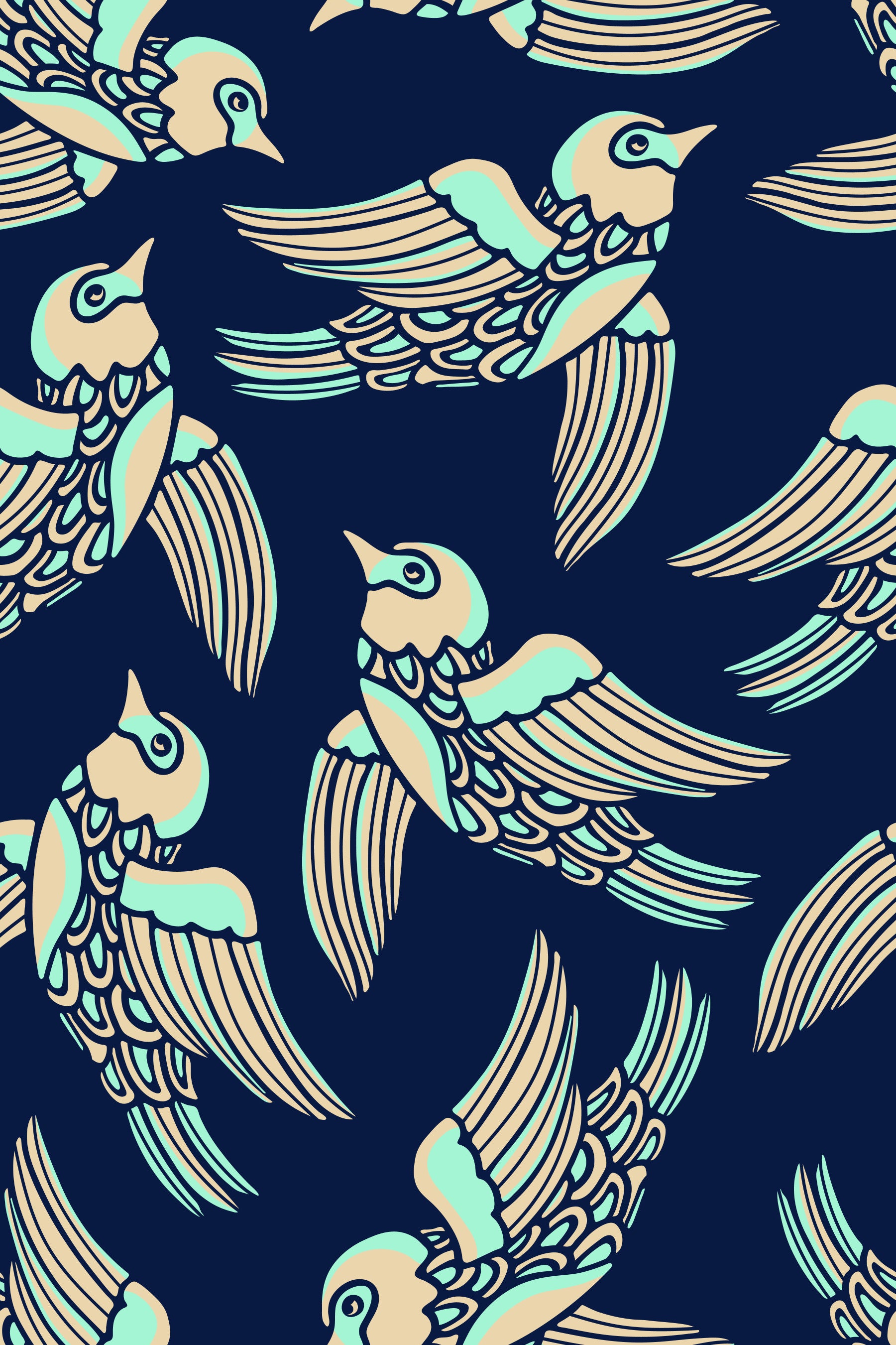 Wallpaper featuring birds in flight on a mint, beige, and midnight blue background.