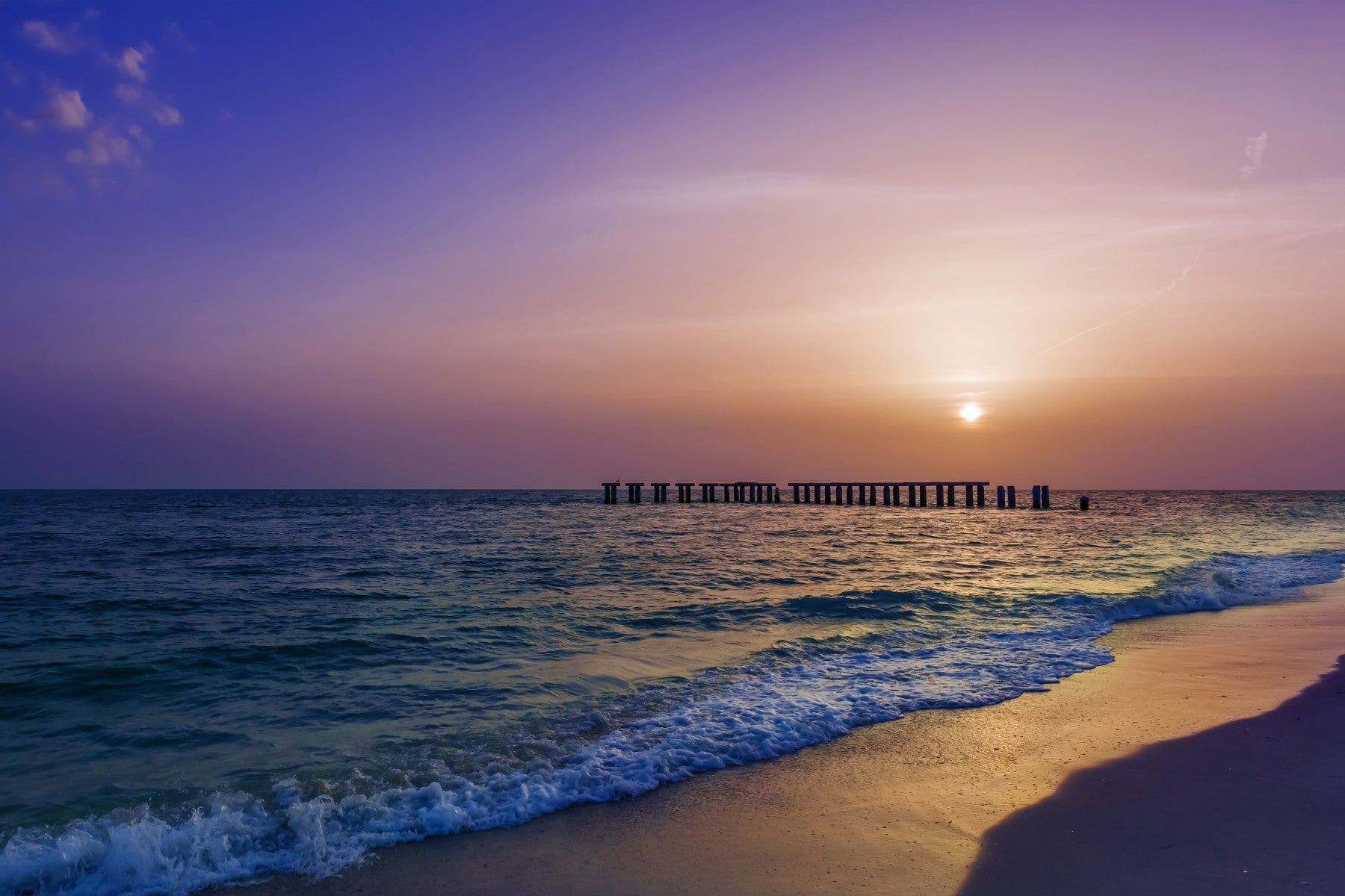 Oplev den betagende skønhed af en Gasparilla Island solnedgang med dette fængslende tapet. Billedet viser en rolig Florida -strandscene, hvor blide bølger kærtegner det gyldne sand, oplyst af de varme nuancer i solnedgangen. En fredfyldt, lilla-drejet himmel skaber en fantastisk kontrast til havets dybe blues og greener. Silhuetten af ​​en forvitret mole, der strækker sig ind i det rolige hav, tilføjer et strejf af mysterium og stille charme. Dette tapet fanger perfekt den fredelige atmosfære og livlige farver på en Gasparilla Island solnedgang og tilbyder en rolig flugt til dit rum.
