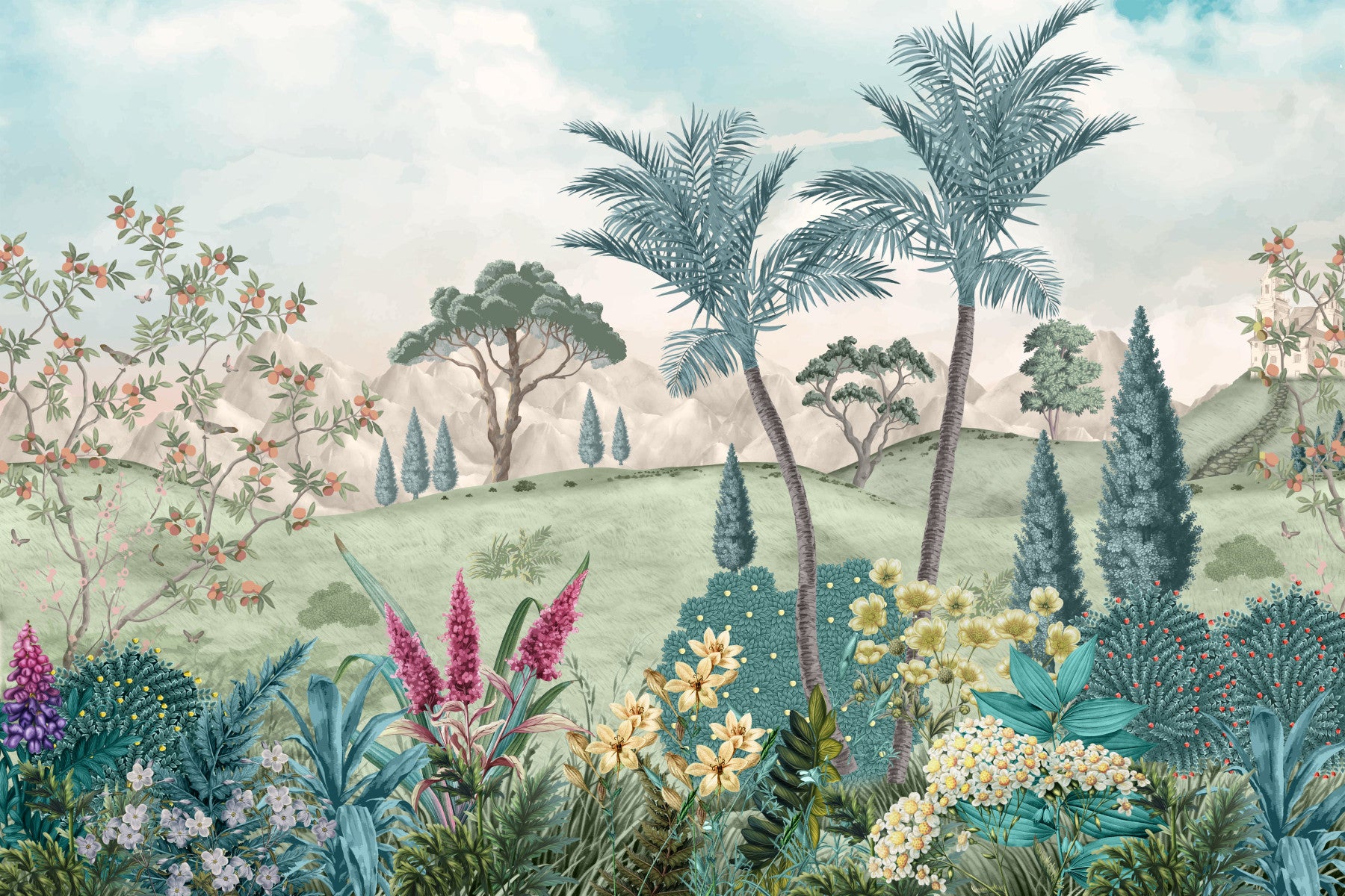 Escape to a peaceful paradise with this enchanting wallpaper. The design showcases stylized palm trees amidst rolling hills and an array of delicate flowers, all rendered in a soft, watercolor style. The cool greens, blues, and gentle pinks create a soothing and relaxing vibe, infusing tranquility. This wallpaper for walls is an exceptional choice for a bedroom, bathroom or nursery. Its design nicely supports relaxing modern, vintage or even Scandinavian design styles.