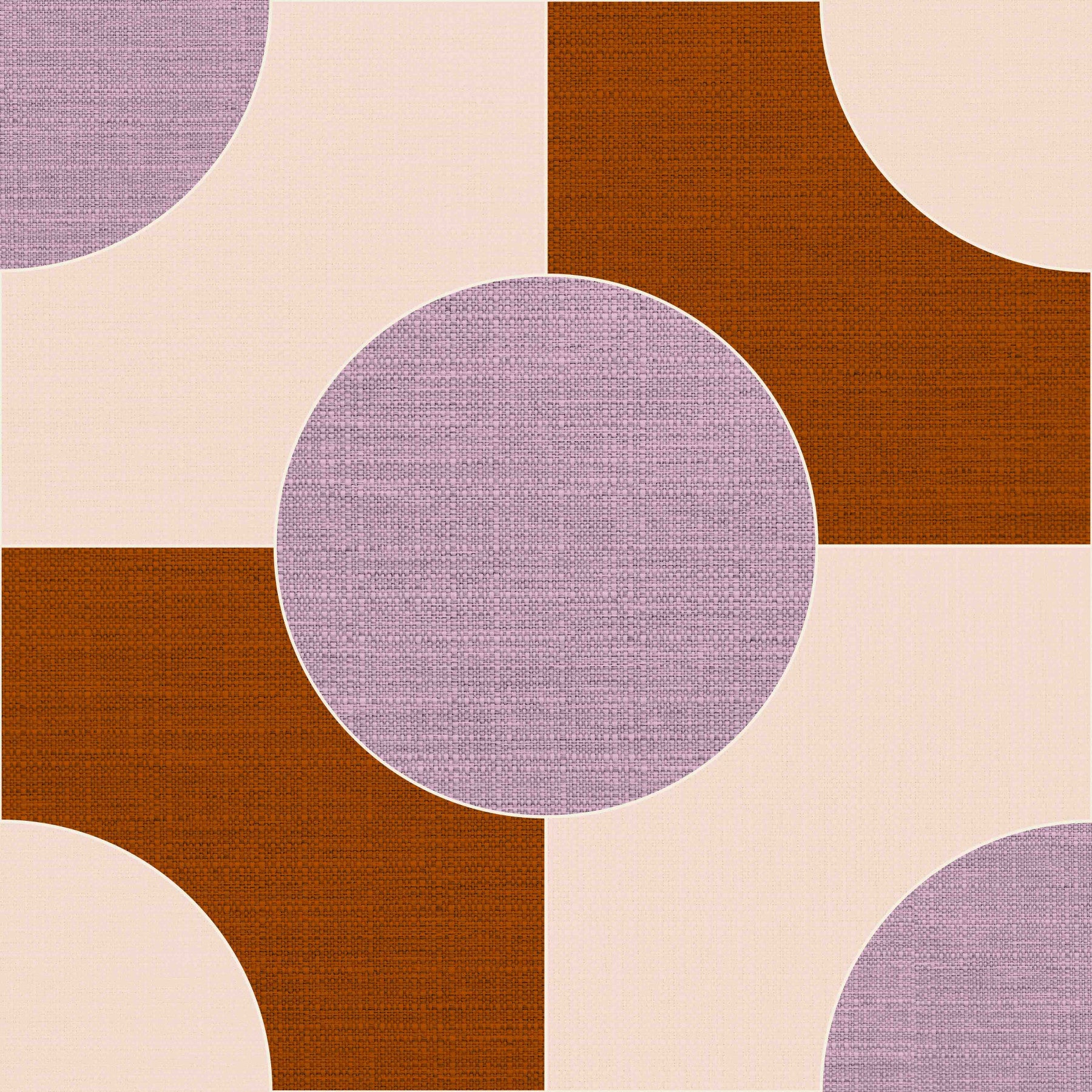 "Geometrisk 03" præsenterer en harmonisk blanding af strukturerede former og subtile teksturer. Designet har sammenflettede firkanter i en beroligende palet af lys beige og jordbrun, sat op mod fremtrædende lilla cirkler og kvartcirkler. Den vævede tekstur, der minder om naturlige stoffer, tilføjer dybde og varme til de rene linjer. Dette møbel fremkalder en følelse af underspillet elegance og rolig sofistikering. Det er en perfekt baggrund for en minimalistisk æstetik, der bringer et strejf af organisk blødhed til moderne digitale rum. Dens afbalancerede komposition og dæmpede toner skaber en visuelt tiltalende og beroligende oplevelse.