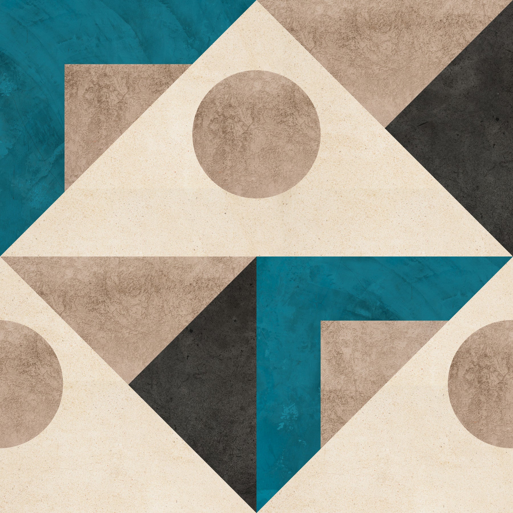 Dette tapet præsenterer et fængslende samspil mellem geometriske former og strukturerede overflader. Jordlige toner af beige, taupe og kulgrå punkteres af livlige teal accenter, hvilket skaber en sofistikeret og moderne æstetik. Det sømløse mønster antyder en terrazzo-lignende effekt, der tilbyder et visuelt rig og beroligende baggrund for ethvert rum. Kombinationen af ​​skarpe linjer og organiske strukturer bringer en følelse af afbalanceret energi, hvilket gør den ideel til moderne eller minimalistisk interiør. Dens neutrale palet giver mulighed for alsidig styling, der supplerer en lang række møbler og udsmykningsvalg.