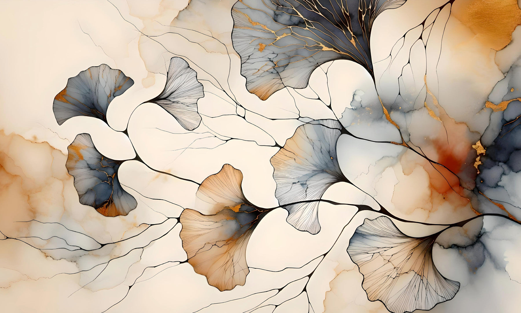 Dette abstrakte tapet har en betagende blanding af akvarel og blæk, der skaber en æterisk atmosfære. Delikate Ginkgo-blade, gengivet i nuancer af grå, beige og guld, sammenflettet med en blød, off-white baggrund. De fine sorte linjer, der skitserer bladene, og deres årer giver en slående kontrast mod de flydende akvarelvask. Tip om rust og brændt orange tilføjer varme, hvilket skaber en beroligende, men alligevel sofistikeret fornemmelse. Den samlede effekt er en af ​​fredfyldt skønhed, perfekt til et rum, der har brug for et strejf af elegance og ro.