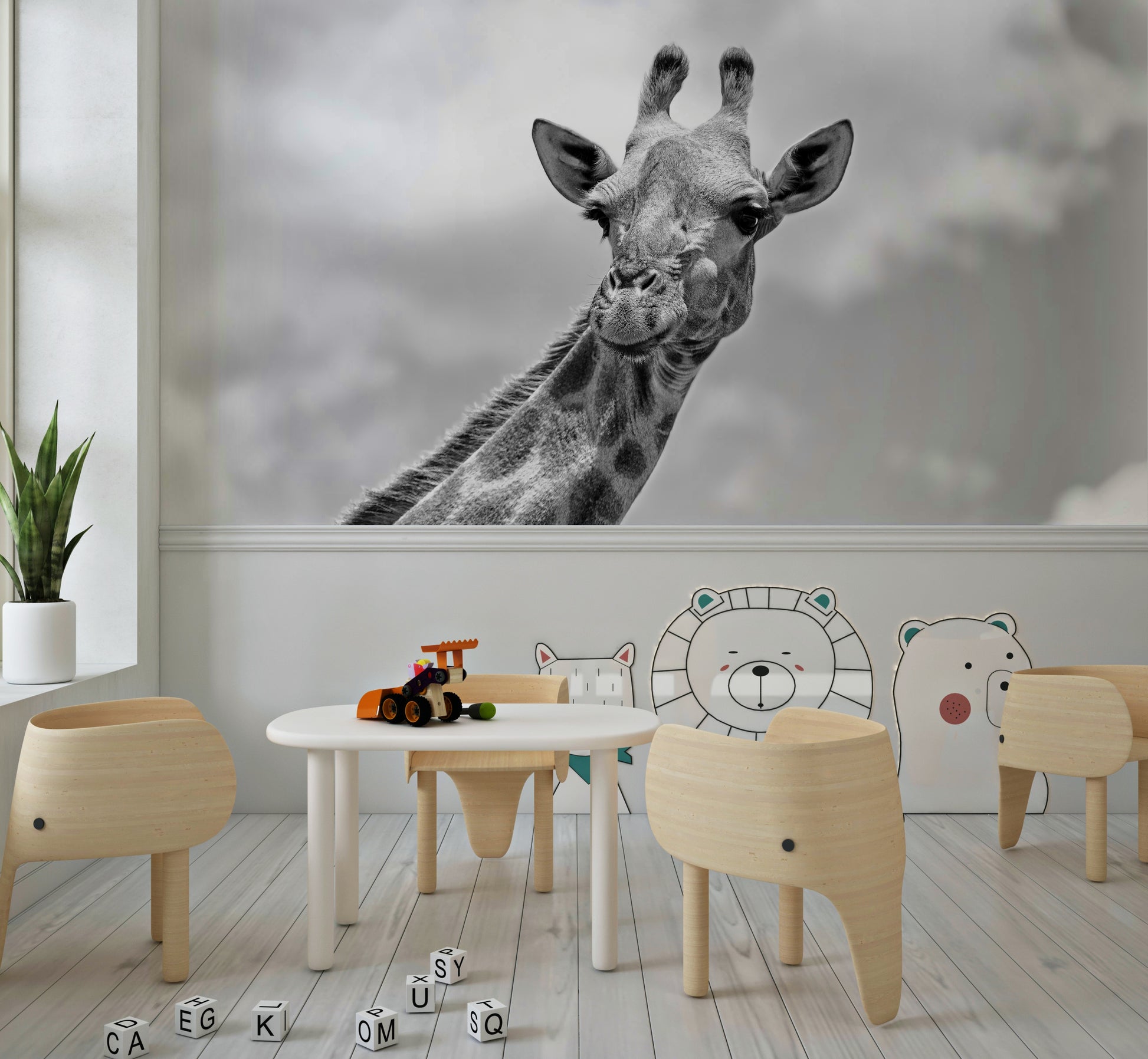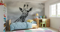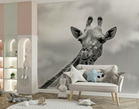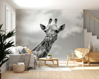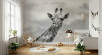 Bring the calm of the savanna to your home with this graceful giraffe portrait. This monochrome wallpaper for walls offers a clean, contemporary style perfect for any room. The high-contrast design makes a statement, while the neutral tones ensure it complements a range of decor styles. Install this in a living room, bedroom, or office to add a touch of wild elegance. The giraffe's gentle expression and striking pattern add depth and interest to interiors.