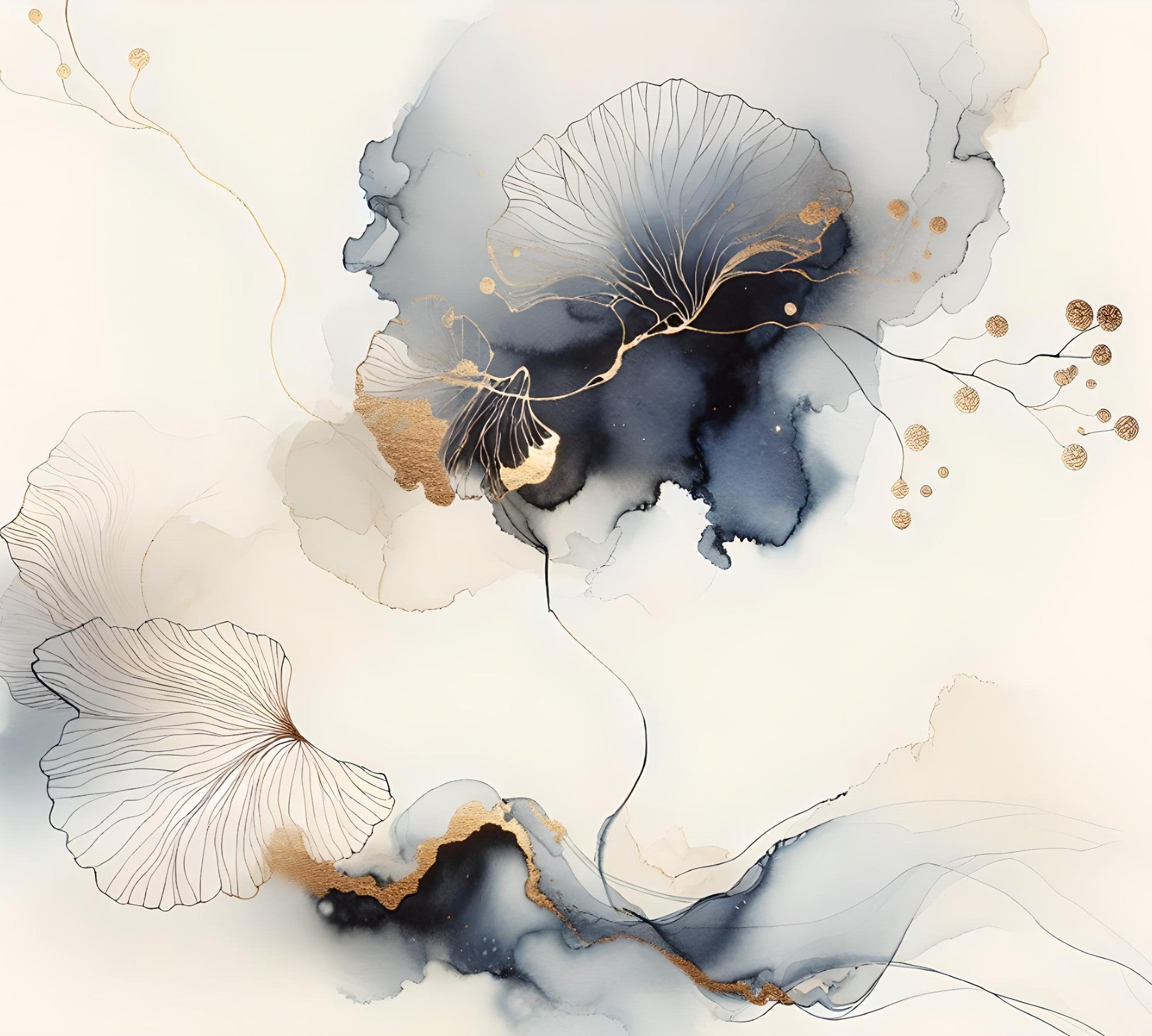 Dette elegante tapet har et drømmende abstrakt kunst i blød blues, grå og guld. Delikate, håndtegnede linjer, der ligner Ginkgo blade, der er sammenflettet med flydende alkoholblækvask, hvilket skaber en følelse af rolig og ro. De subtile guld accenter tilføjer et strejf af luksus, mens den samlede palet fremkalder en følelse af sindsro og fred. Perfekt til soveværelser, stuer eller ethvert rum, hvor der ønskes en sofistikeret og afslappende atmosfære. Designet er både moderne og tidløst, hvilket gør det til et alsidigt valg for forskellige interiørstilarter.