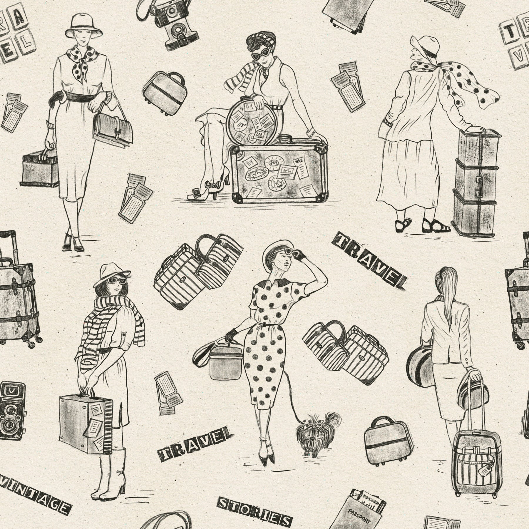 Let your walls tell a story of travel and timeless style. The design features chic travelers and vintage suitcases in a pencil sketch style, presented in a monochromatic palette. The pattern and design are suitable for a bedroom, hallway, or home office. With its neutral tones and sophisticated design, this wallpaper for walls enhances interiors, creating a focal point of interest and conversation.