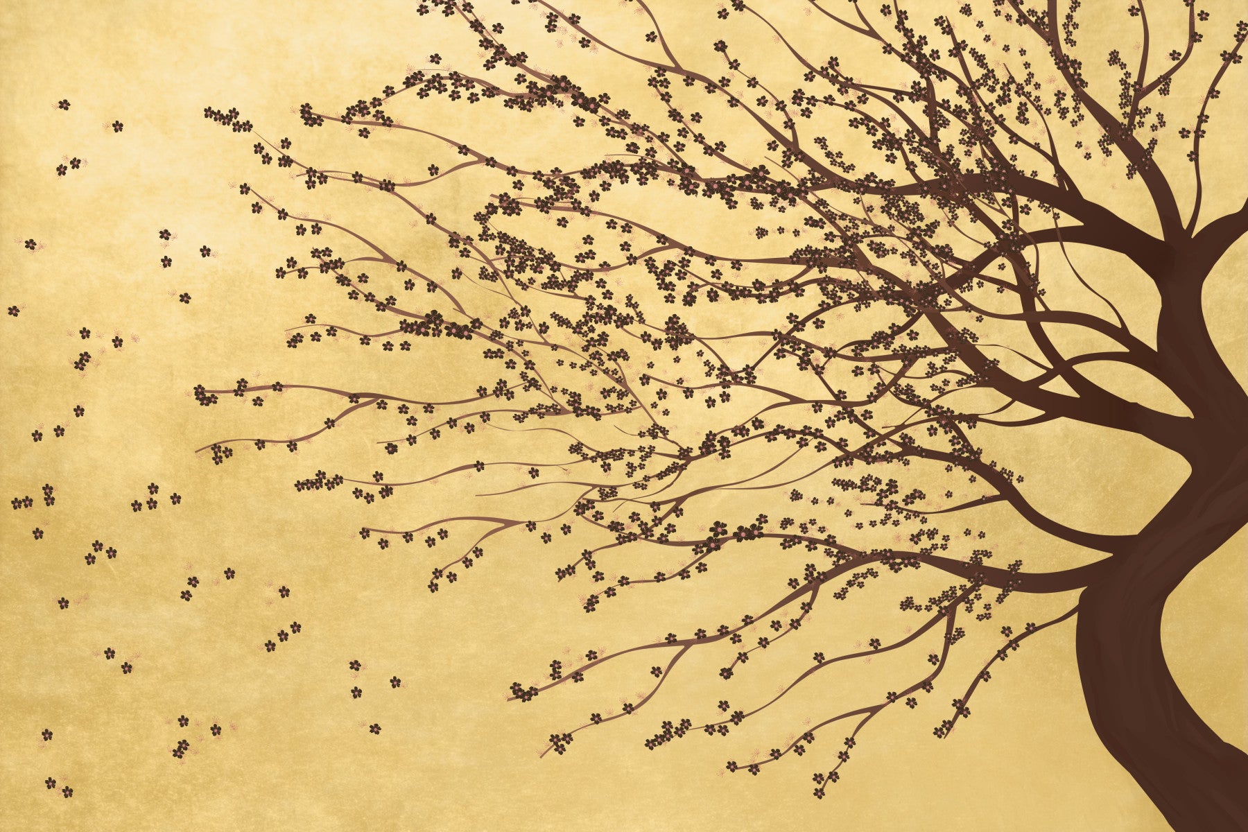 Infuse your home with the serene beauty of this delicate floral design. Against a warm gold backdrop, a stylized tree with dark blossoms stands, its branches swaying in an unseen breeze. This wallpaper for walls brings a touch of nature's tranquility to any room. The simple, elegant design works perfectly in a bedroom, creating a calming atmosphere, or in a living room as a sophisticated, subtle statement piece. The rich gold and brown tones add warmth and depth, complementing both modern and traditional interiors. Let this stunning wallpaper transform your space into a haven of peace and style.