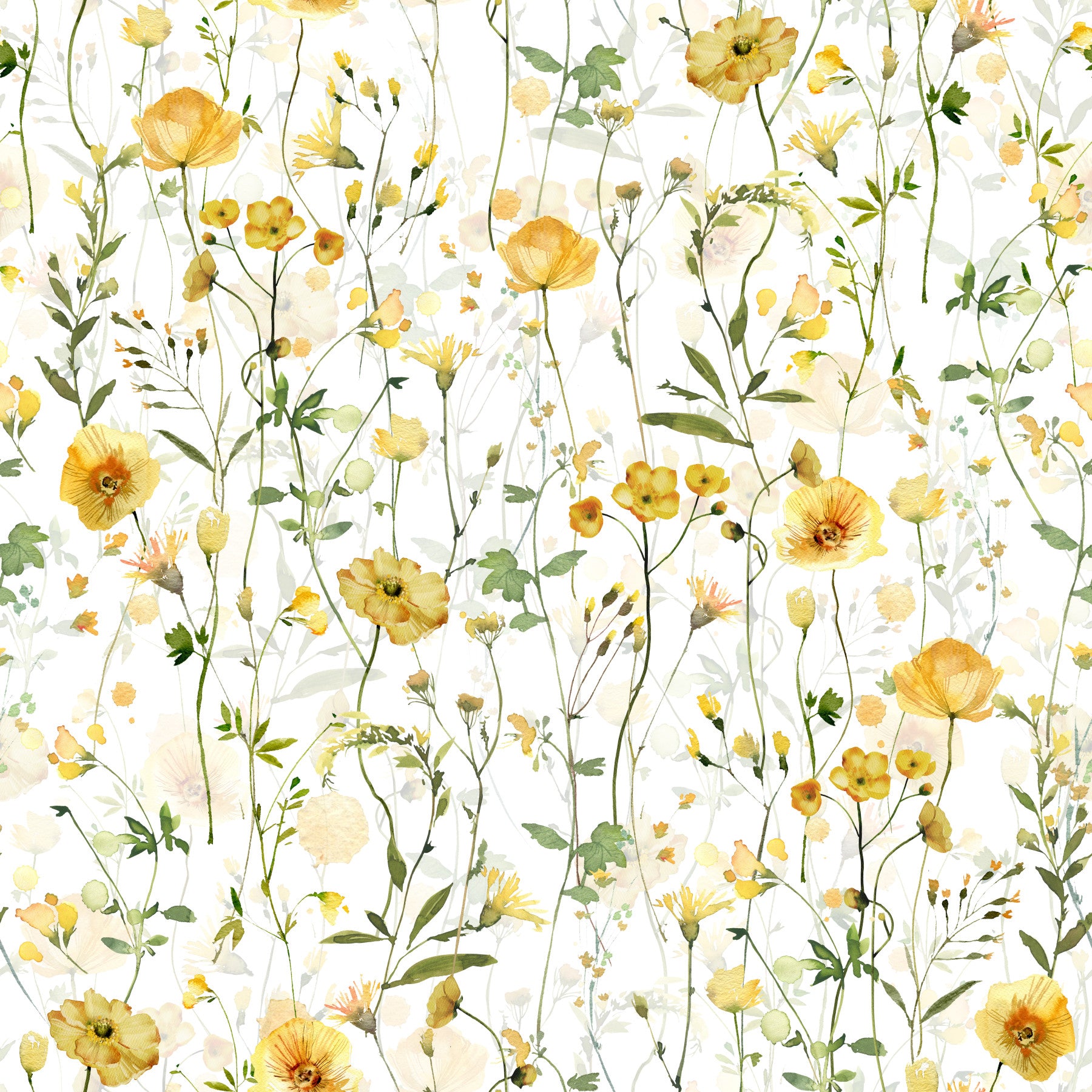 Bring sunshine indoors with this watercolor floral wallpaper for walls by Uta Naumann. Gentle yellow wildflowers dance across a clean white backdrop, creating a sense of open space and fresh air. The delicate brushstrokes highlight the beauty of nature, making it a great choice for bedrooms and living rooms that need a touch of tranquility. Soft green stems and leaves complete the look, and this wallpaper brings nature to modern homes.