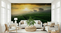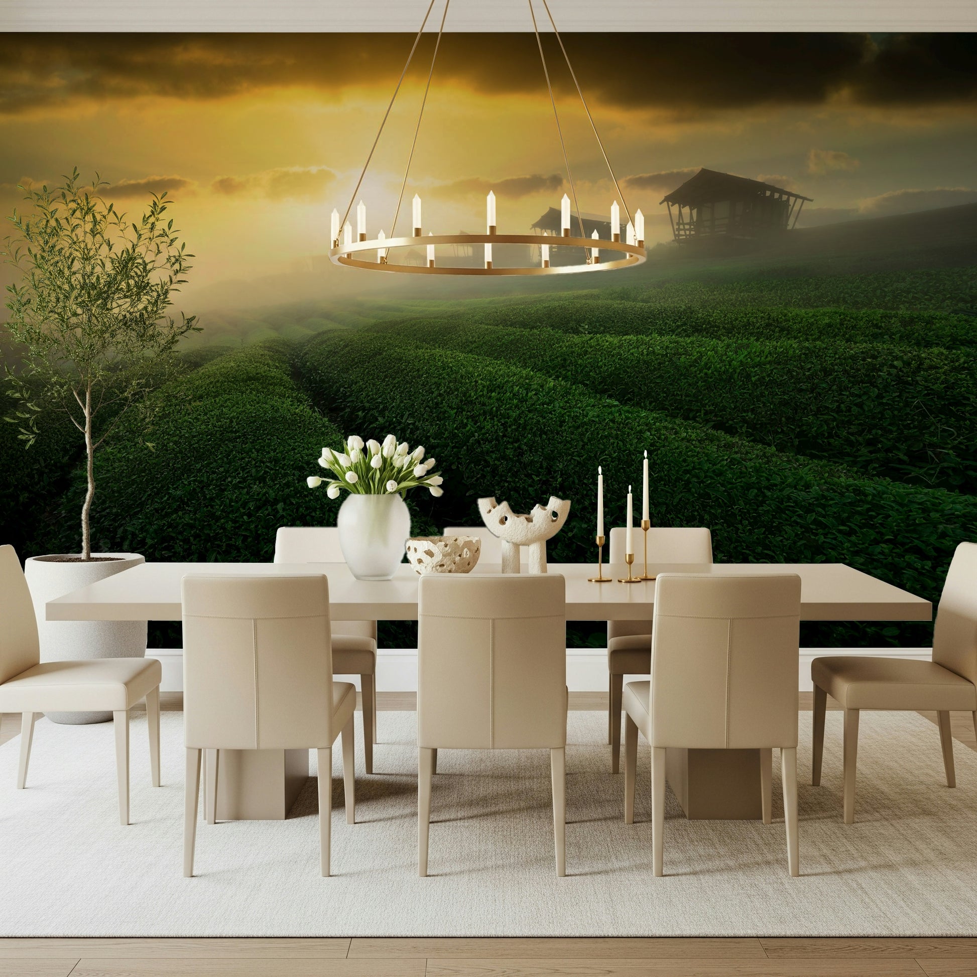 Transform any space with this image that captures the magic of dawn. Rolling green tea fields, shrouded in mist, greet the morning sun with simple farm buildings. Picture this wallpaper for walls in a bedroom or home office where you wish to evoke a sense of serenity. It brings the outdoors in, enhancing any room with the soft hues and calm feeling of nature.