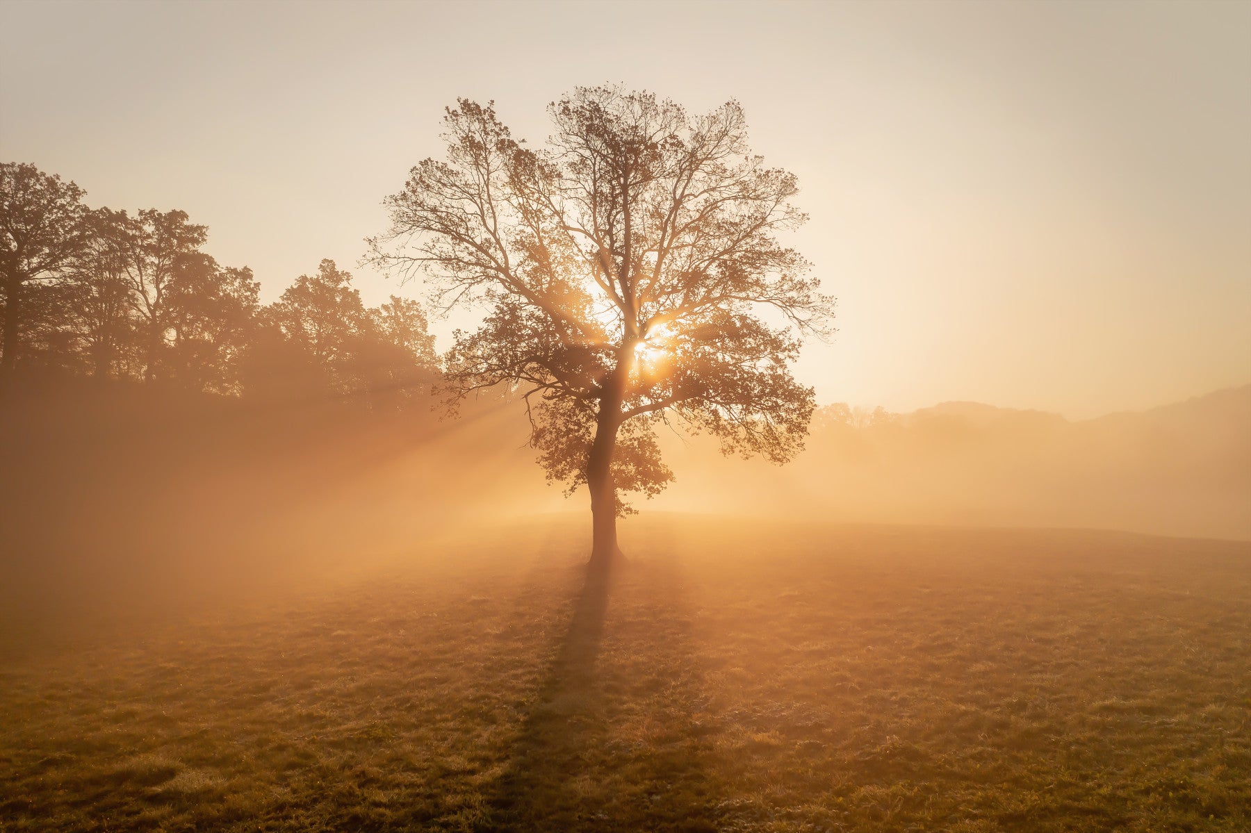 Solitary tree Golden Mist wall mural, radiant sunrise light.
