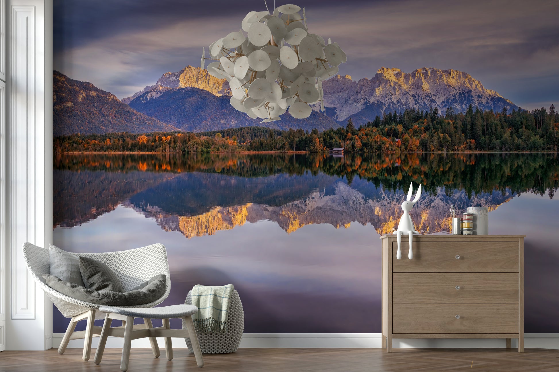 Capture the beauty of dawn with this impressive landscape. The wallpaper presents a tranquil lake mirroring snow-dusted mountains under the warm glow of sunrise. Vivid hues paint the scene, offering a beautiful contrast between the cool water and the glowing peaks. Use this wallpaper for walls to transform any space into a peaceful retreat. Perfect for bedrooms, living areas, or even a home office, it infuses interiors with a sense of calm and natural wonder. The reflected design enhances both light and dark color palettes.
