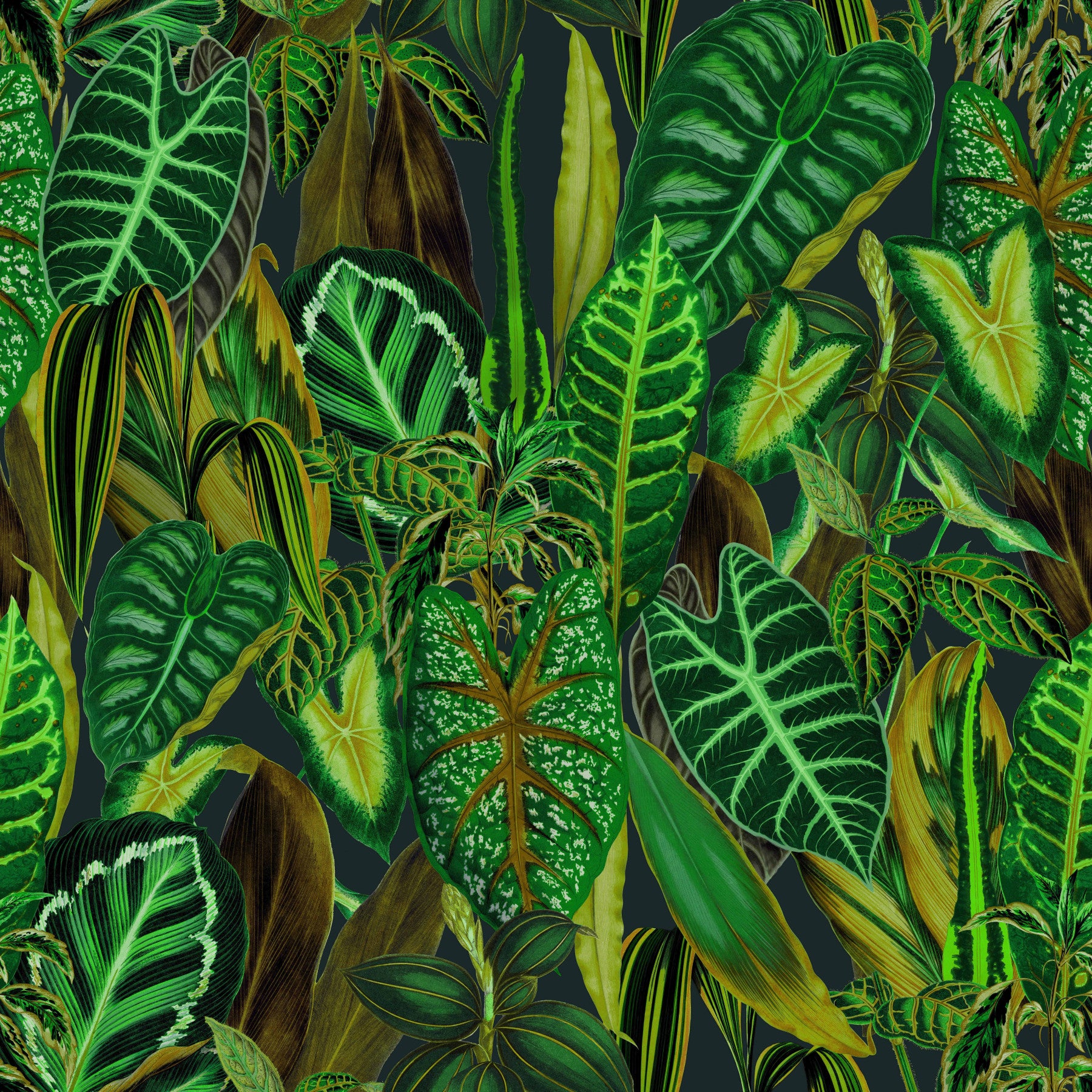 Experience the beauty of a dense jungle with this bold wallpaper pattern. The arrangement of tropical leaves combines shades of deep green and warm brown to make your space feel refreshed and grounded. This design of wallpaper for walls adds a vibrant character to any room. Consider this green tapestry enriching a study, library, or studio. The design infuses energy into the space, creating a warm ambiance. It complements different interior styles, adding a fresh, botanical touch.