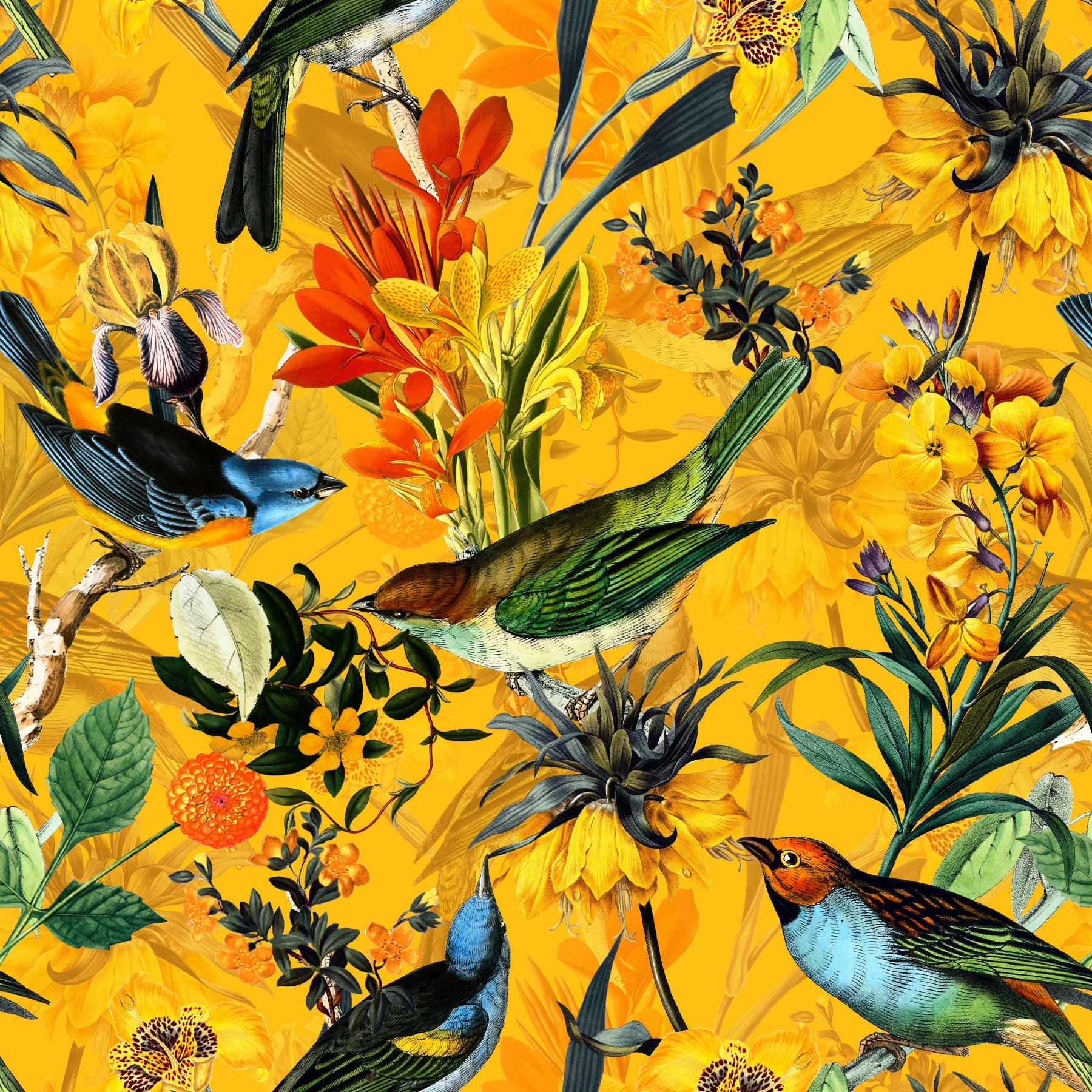 Fordyb dig i den livlige energi fra 'Golden Hour Aviary', et tapetdesign, der brister med de rige nuancer af en tropisk solnedgang. Indviklede botaniske illustrationer af eksotiske blomster, herunder livlige cannas og solkyssede liljer, sammenflet med omhyggeligt detaljerede fugle i en blændende visning af naturens kunstnerskab. Den dristige gule baggrund forbedrer intensiteten af ​​appelsiner, røde og grønne, hvilket skaber en visuelt fængslende og energisk atmosfære. Dette tapet er perfekt til at tilføje et strejf af finurlig luksus og eksotisk charme til ethvert rum og omdanne det til et tilflugtssted af livlig skønhed.