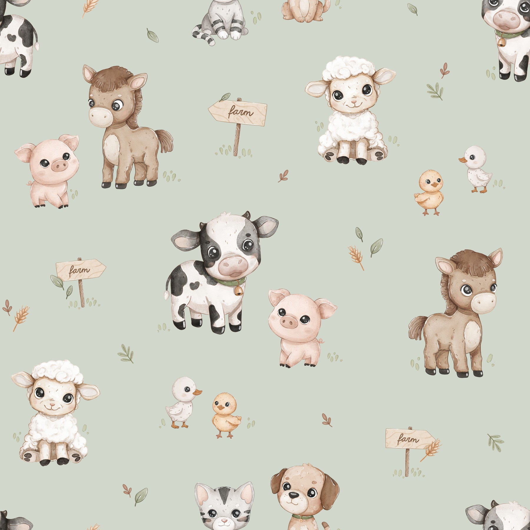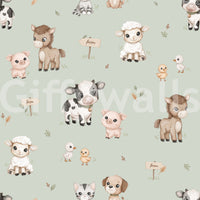 Soft green farm wallpaper with happy animal characters