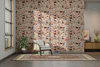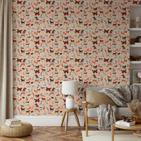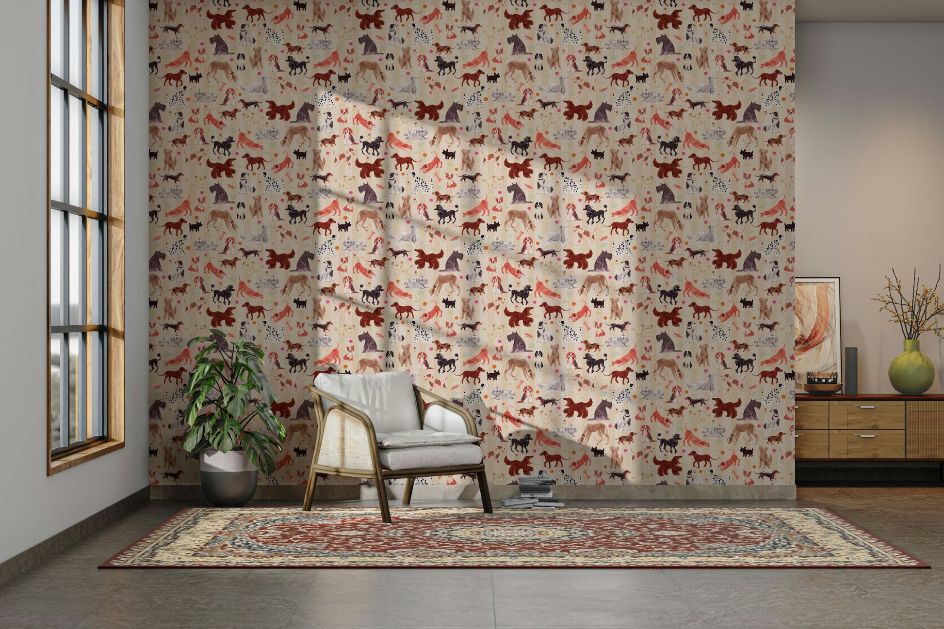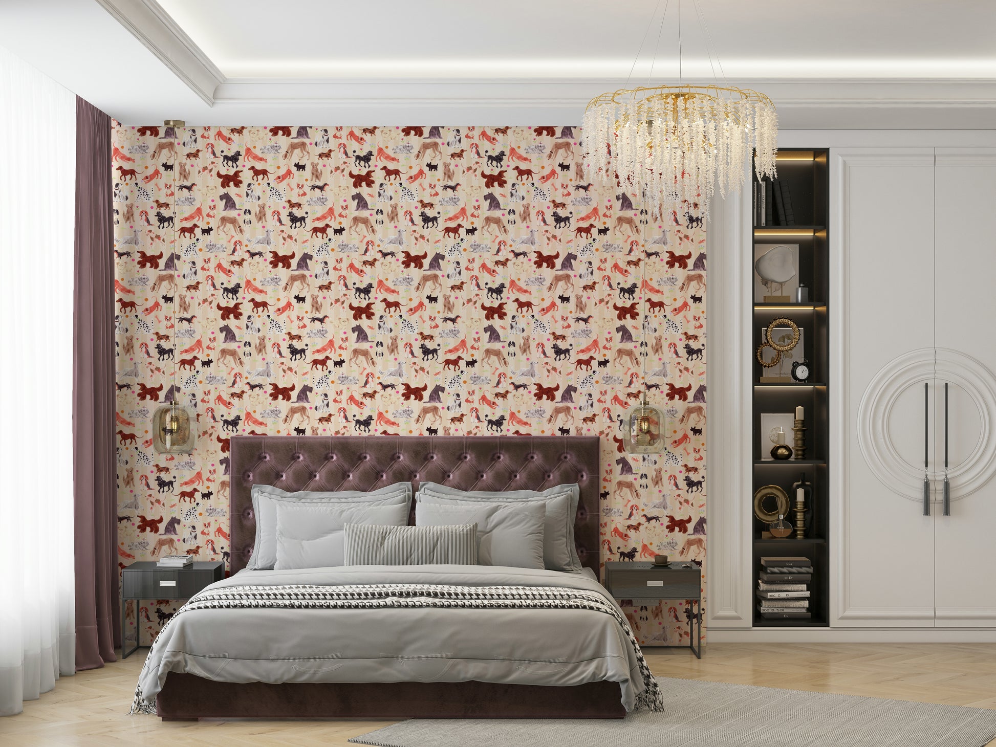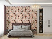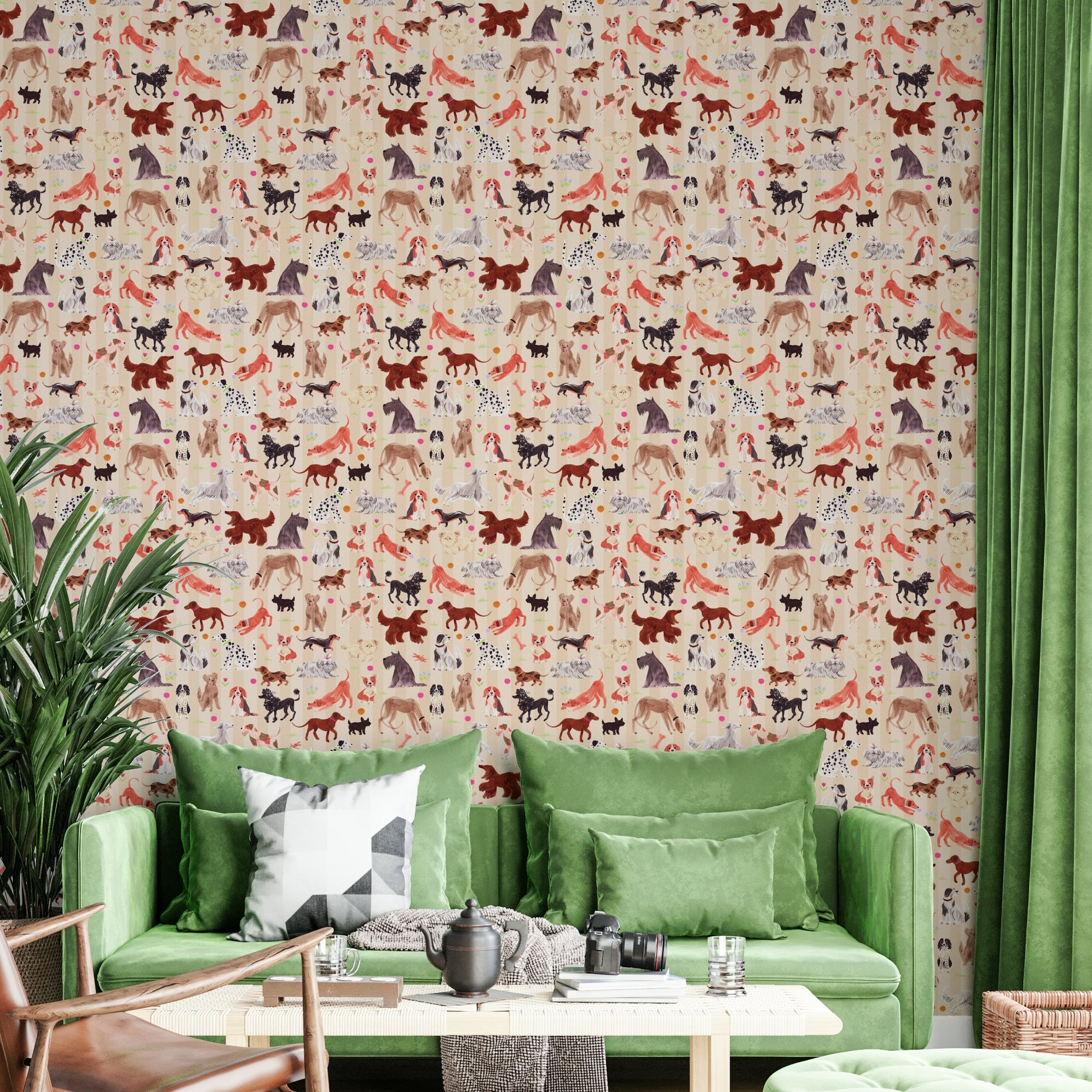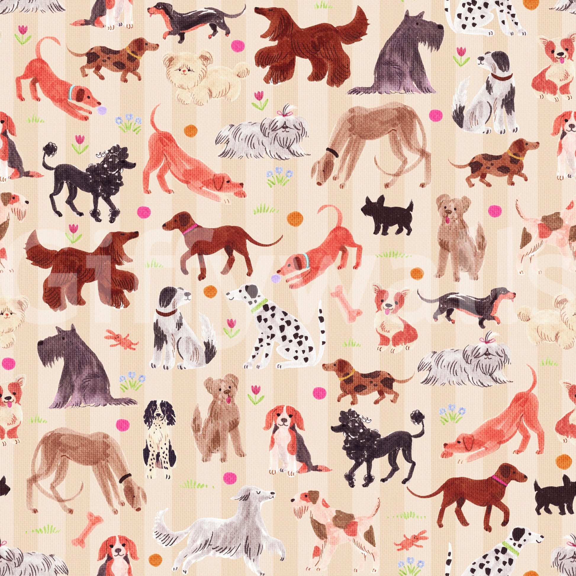 Et dejligt tapet med en charmerende samling af håndtegnede hunde. Hver hvalp, der er gengivet i en finurlig akvarelstil mod en blød beige og stribet baggrund, udstråler lykke og legende energi. Fra legende tax til elegante afghanske hunde, en forskelligartet række racer, der er brudt midt i spredte blomster og legende knogler, hvilket skaber en munter og levende scene perfekt til hundeelskere.